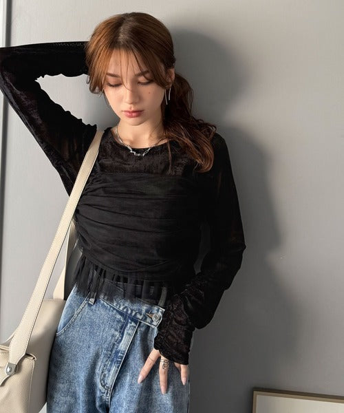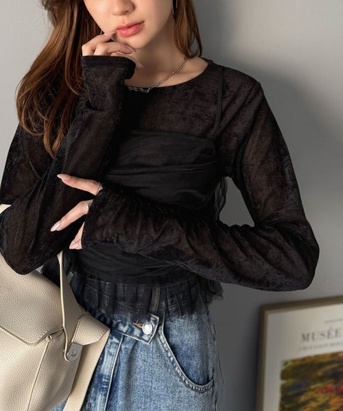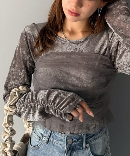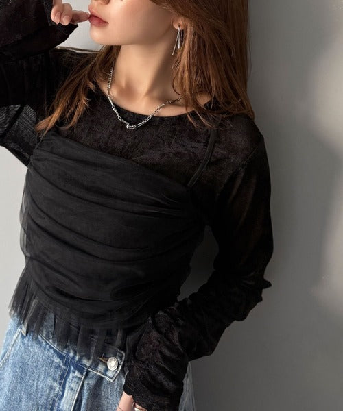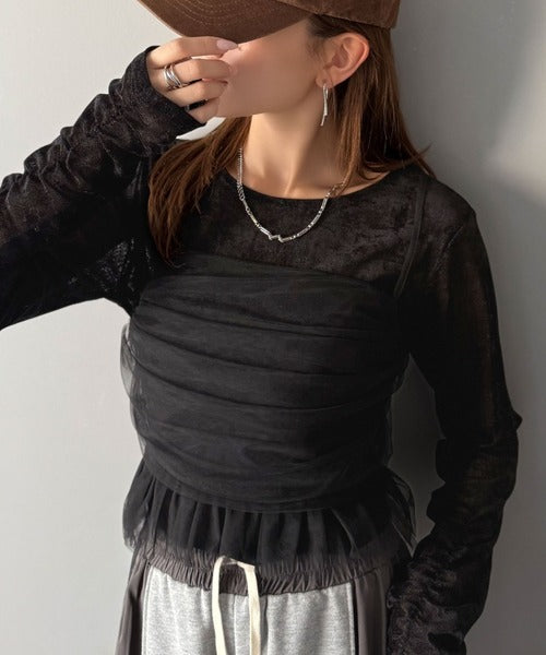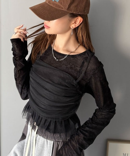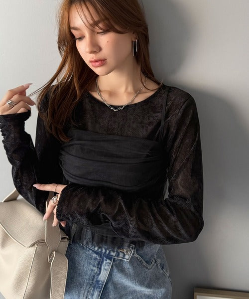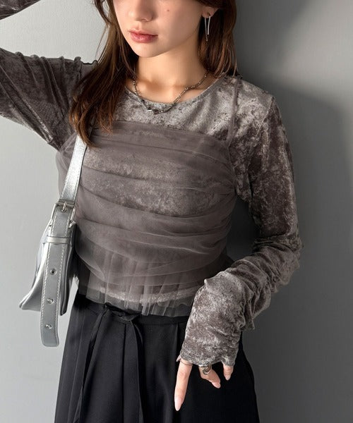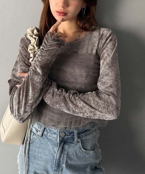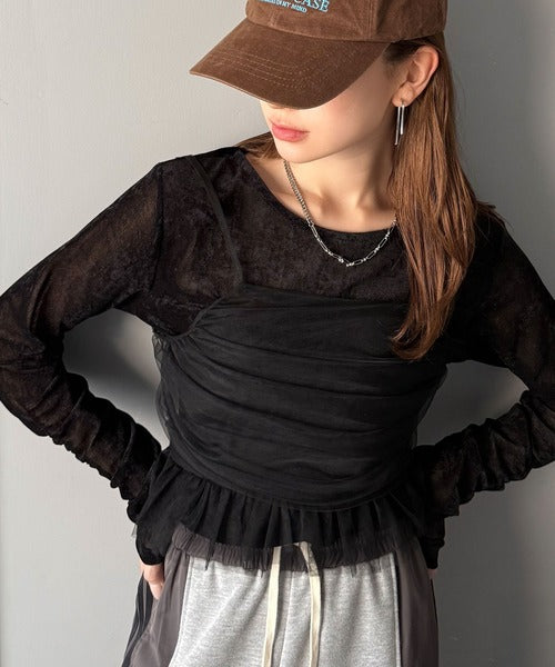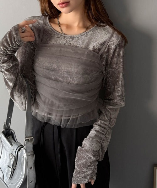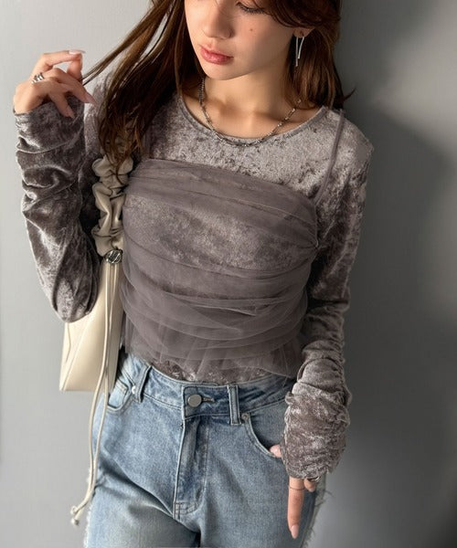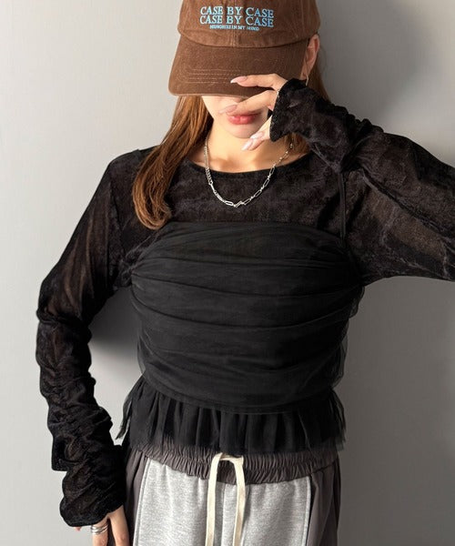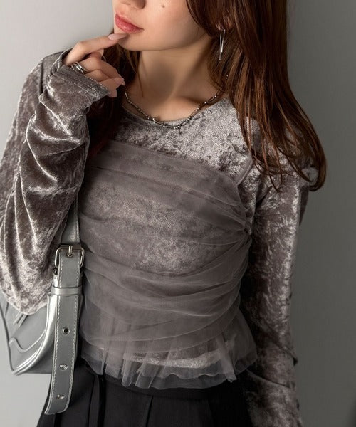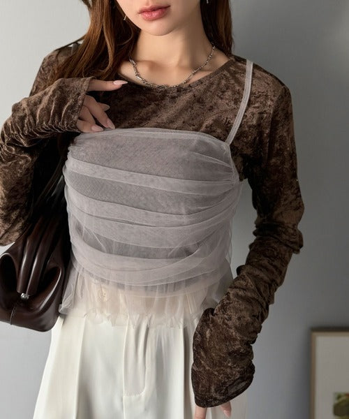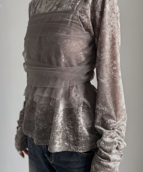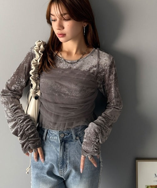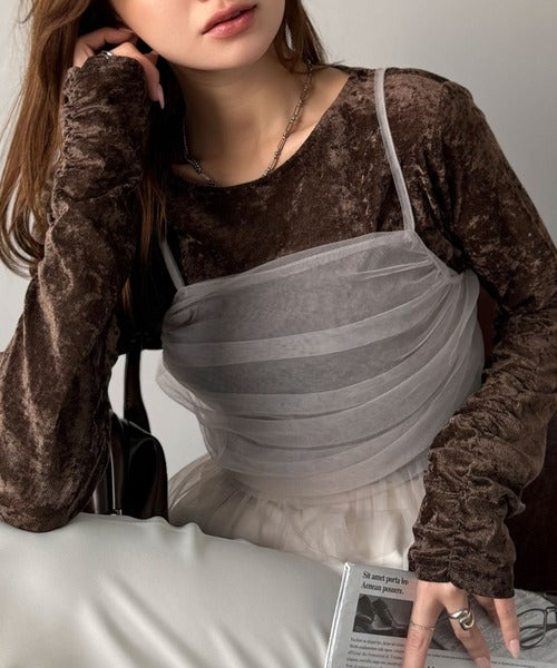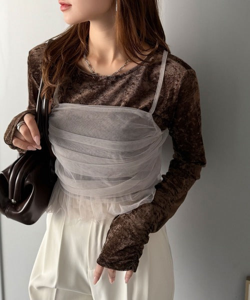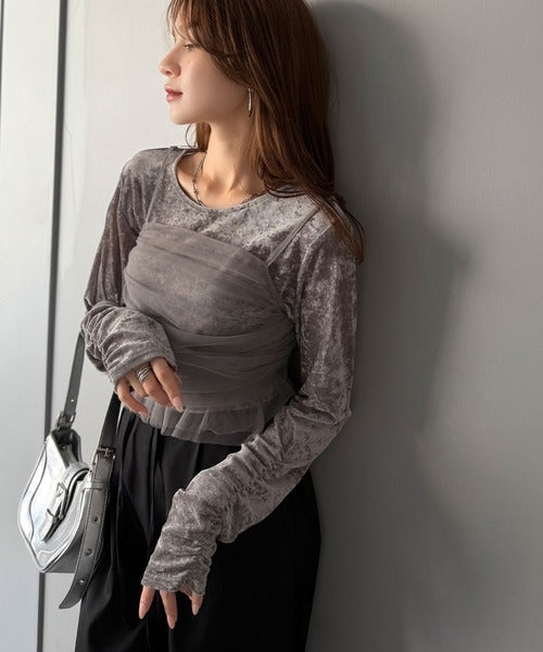 柔らかいベロア素材のインナーと透け感がかわいいチュールのビスチェ。