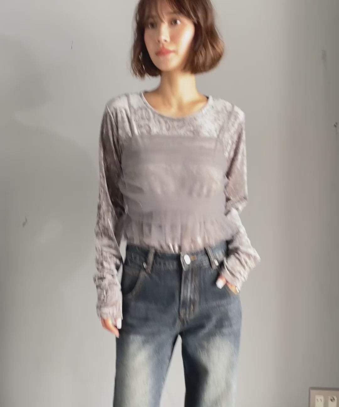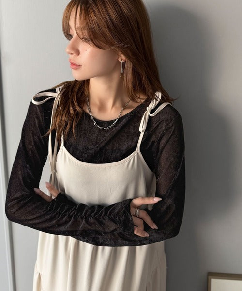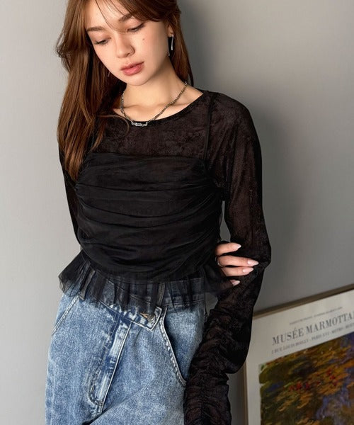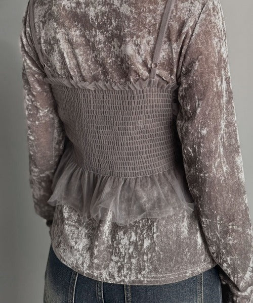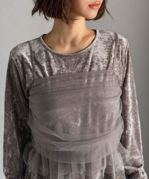 クラシカルな雰囲気漂うベロアトップスと透け感のあるチュールビスチェが愛らしいセットアイテム。