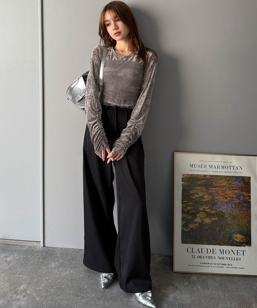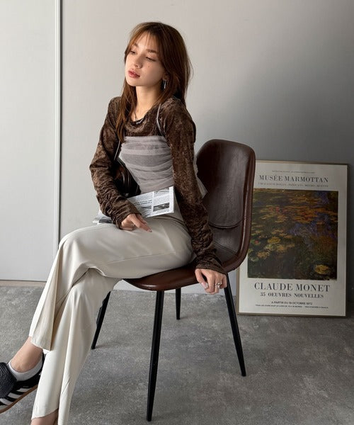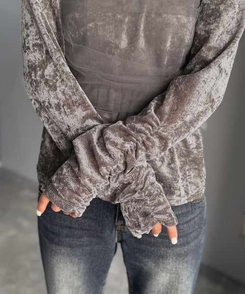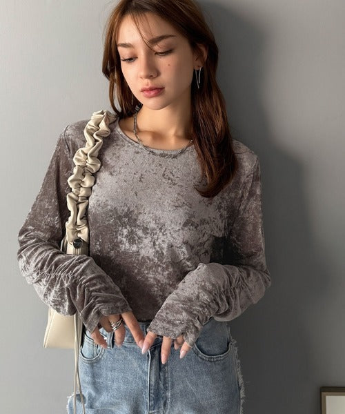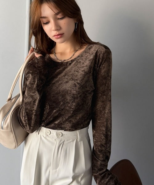 クラッシュ加工が施されたベロアは、甘さを抑えた大人フェミニンな印象を与えます。