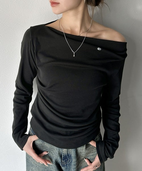ひと癖あるアシメネックデザインが特徴のシェルボタン使いドレープカットソー。