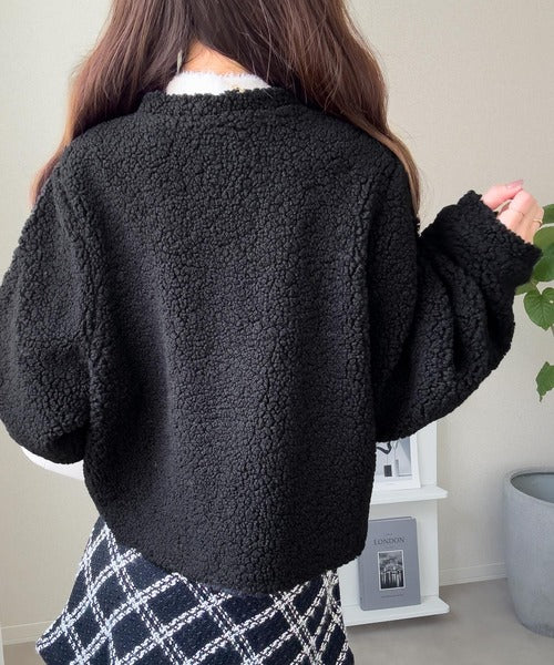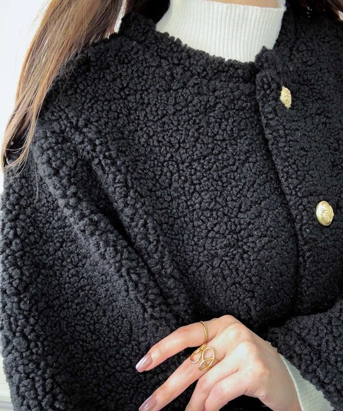 ゴールドのエンブレム釦がリッチに映える、ボリュームボアジャケット。