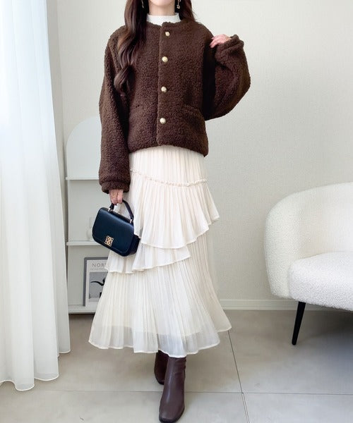 ふんわりとしたボア生地が季節感を高め、羽織るだけで華やかなスタイルに仕上がります。