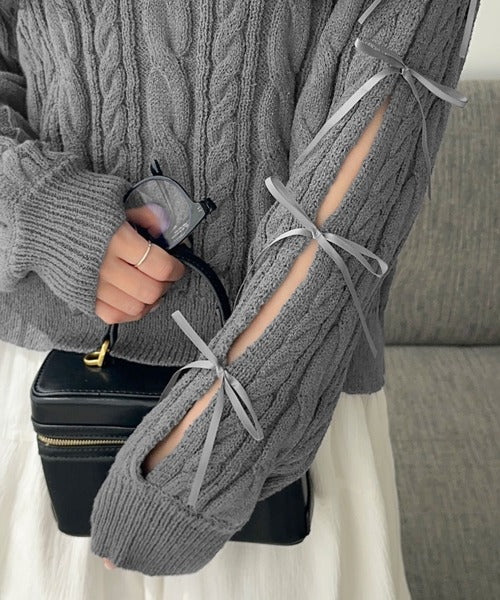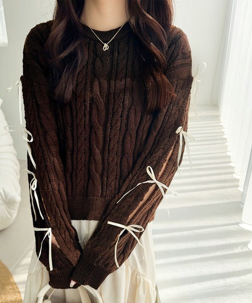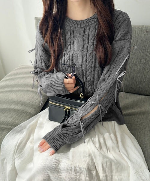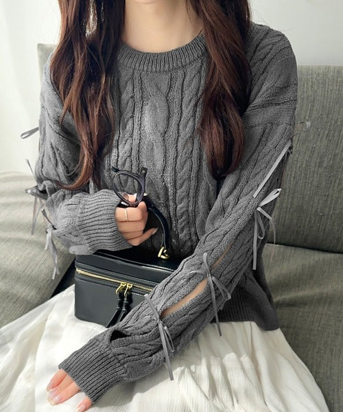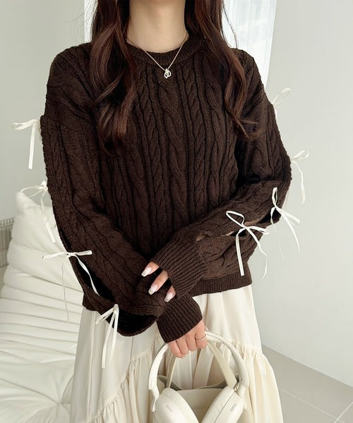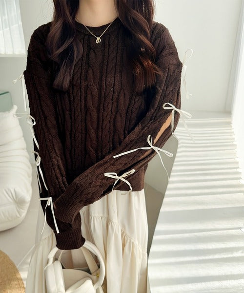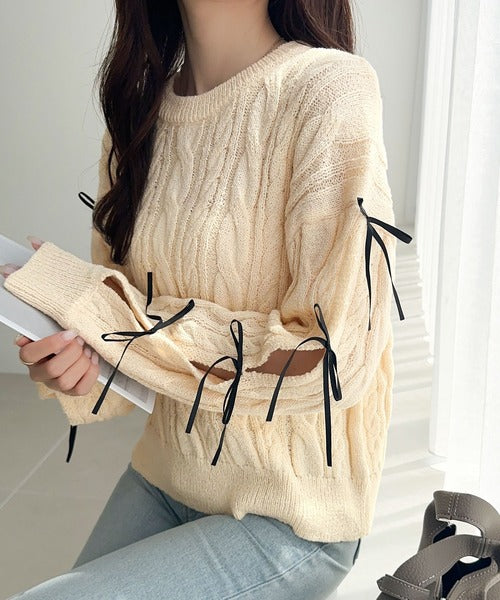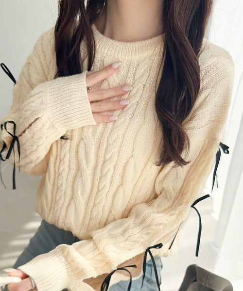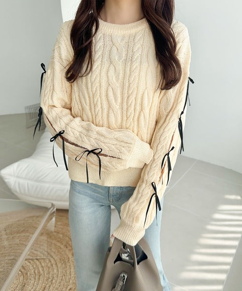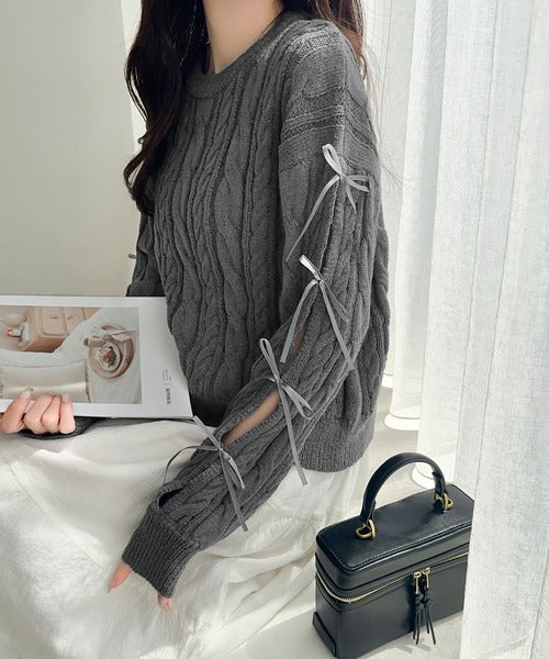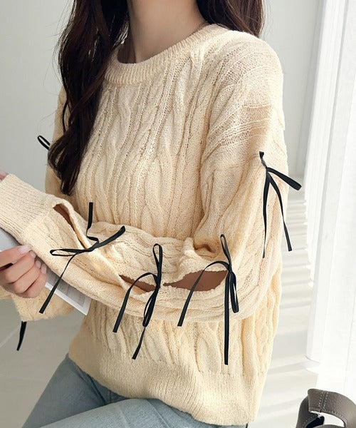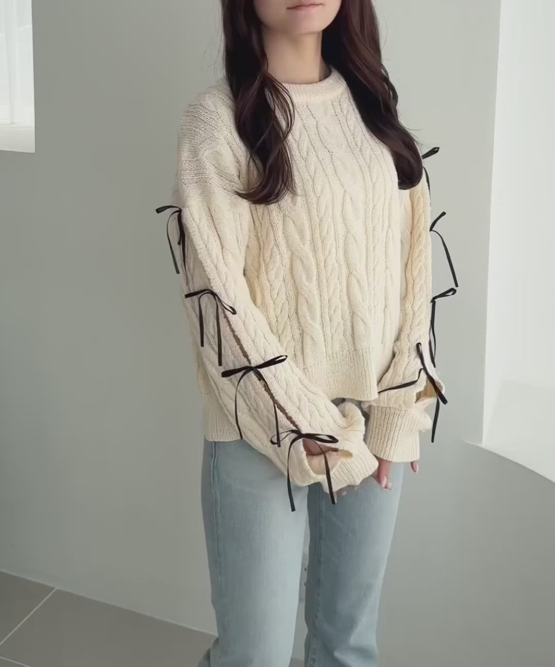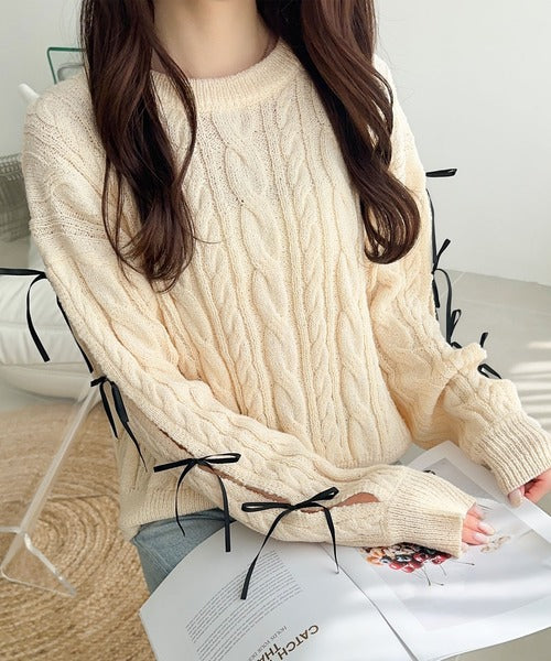 【mily bilet】リボンで仕込む♪上品フェミニン。袖リボンケーブル編みニットプルオーバー mi1359026