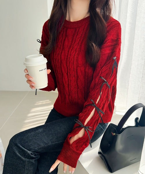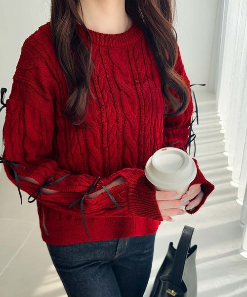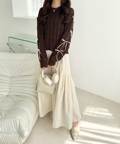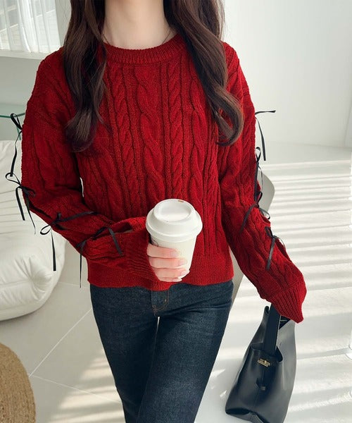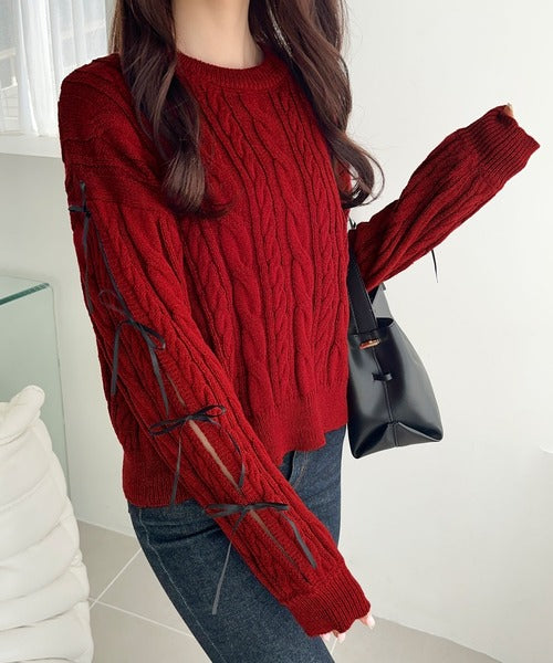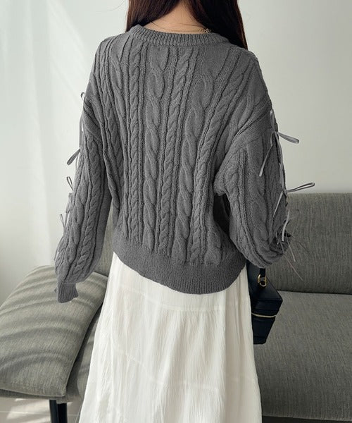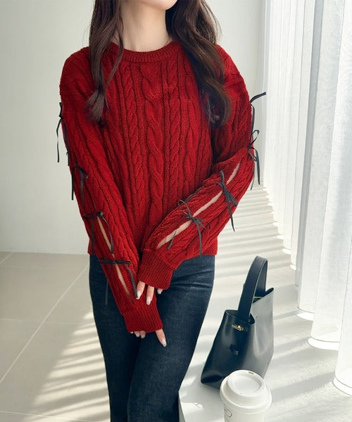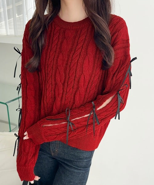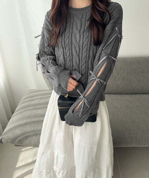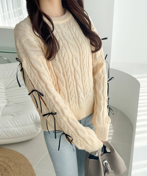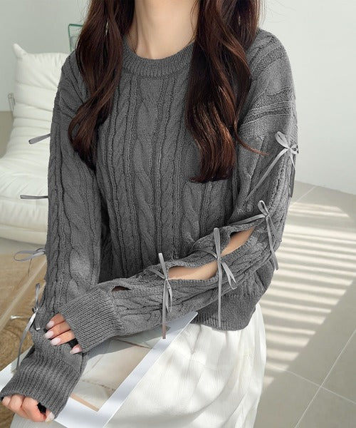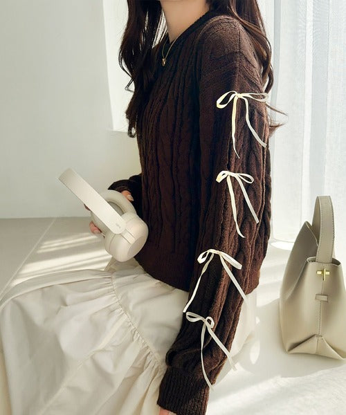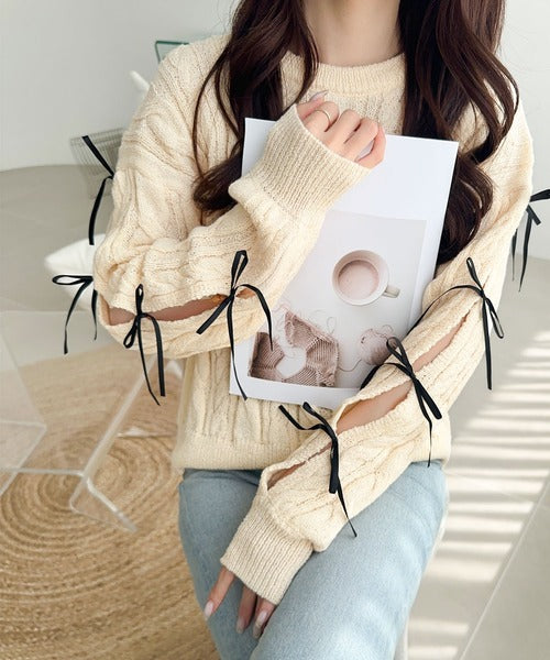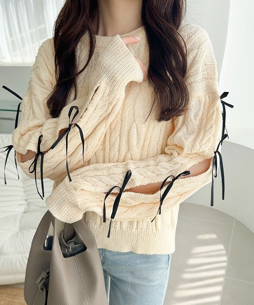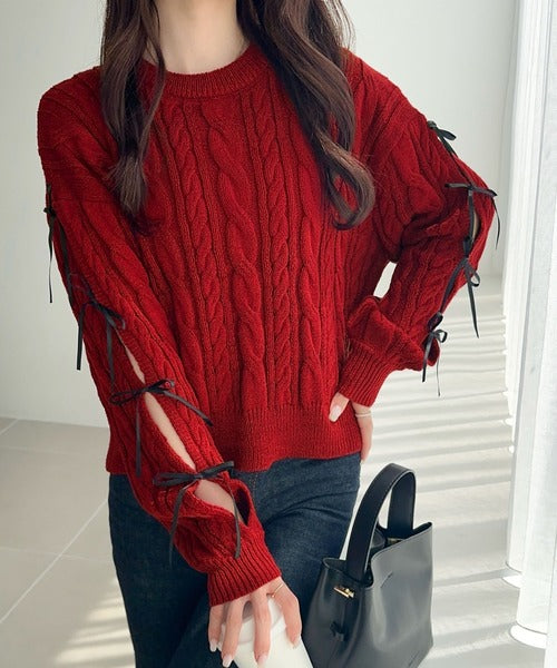 【mily bilet】リボンで仕込む♪上品フェミニン。袖リボンケーブル編みニットプルオーバー mi1359026
