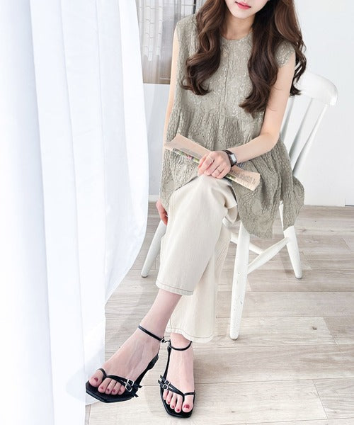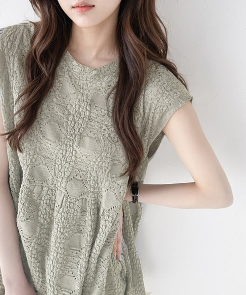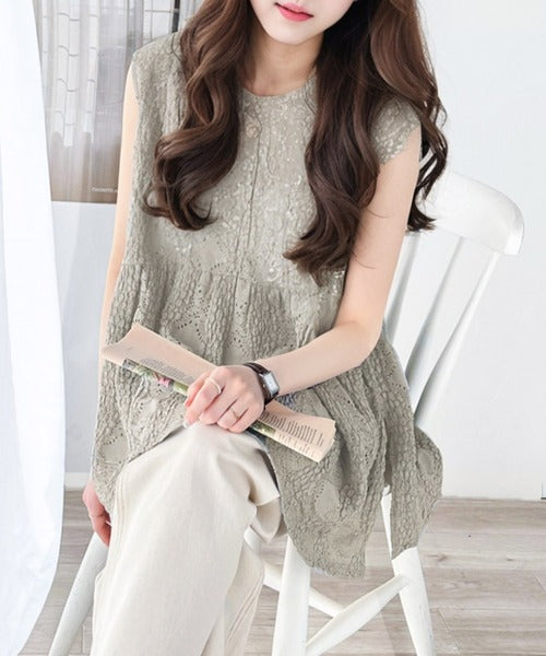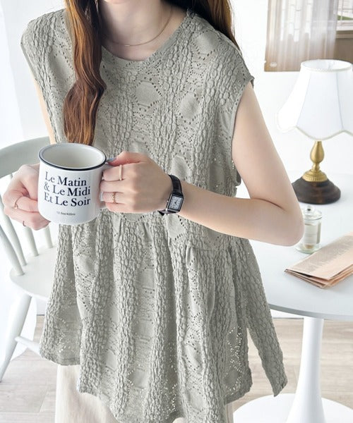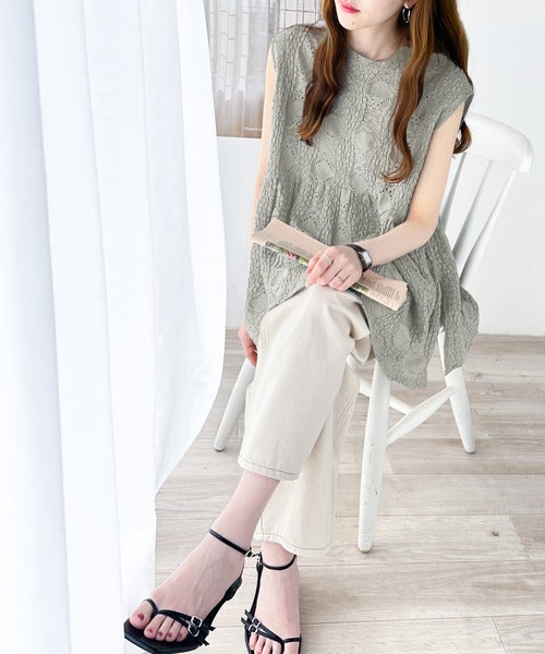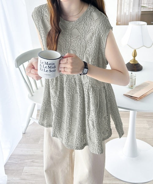 ぽこぽこした立体感のあるレースを使用した、ノースリーブのブラウス。