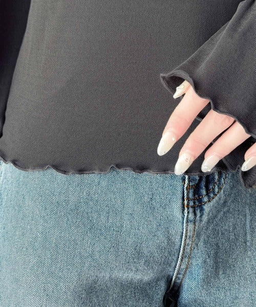 トップスのフリルがアクセントになり、デニムやフレアパンツと合わせて