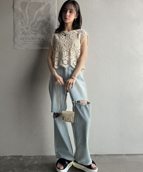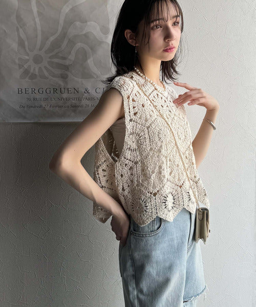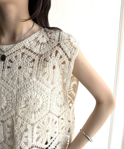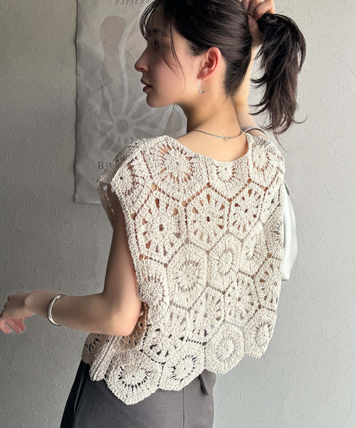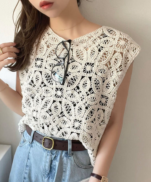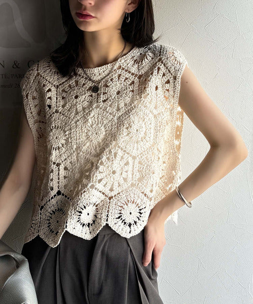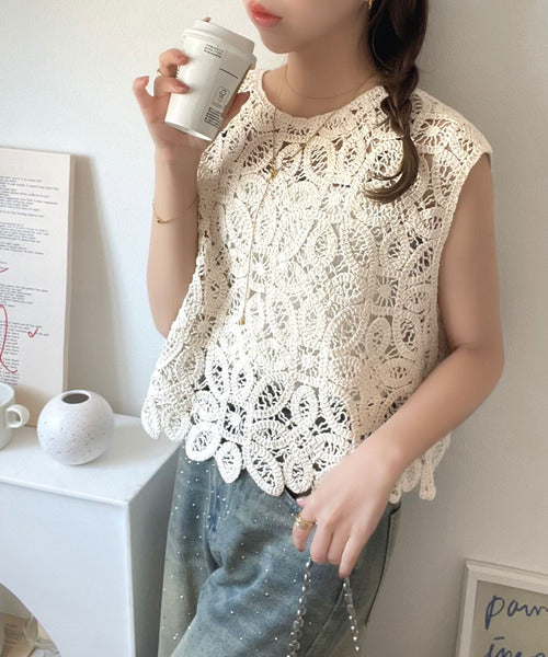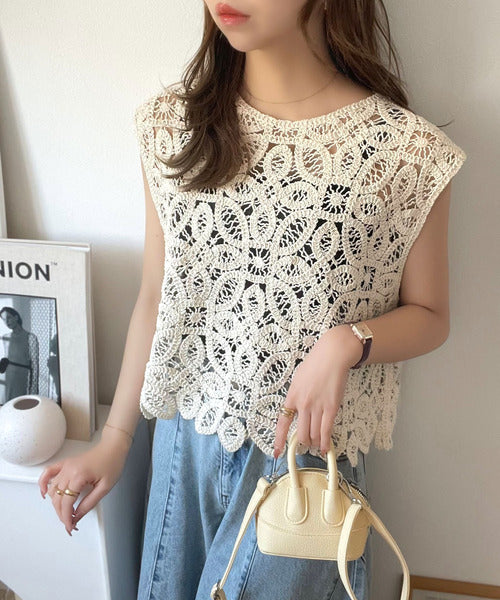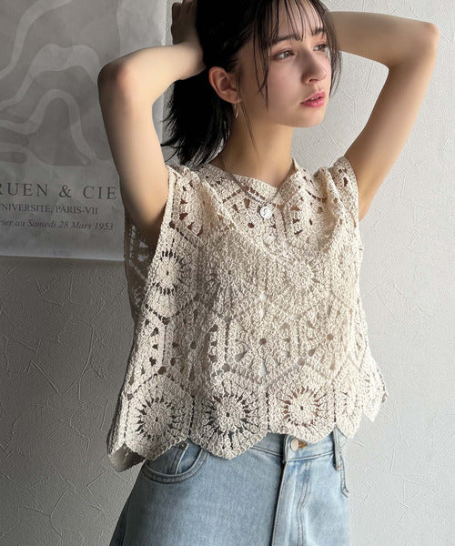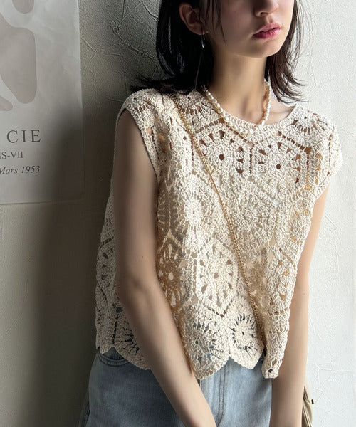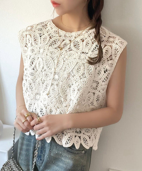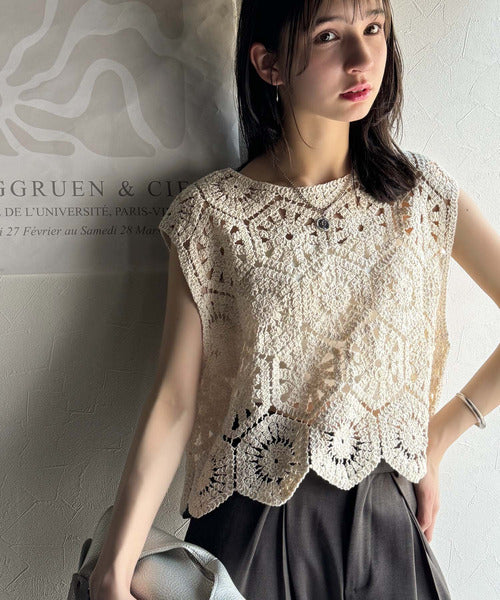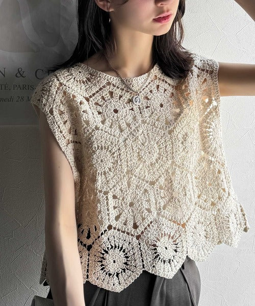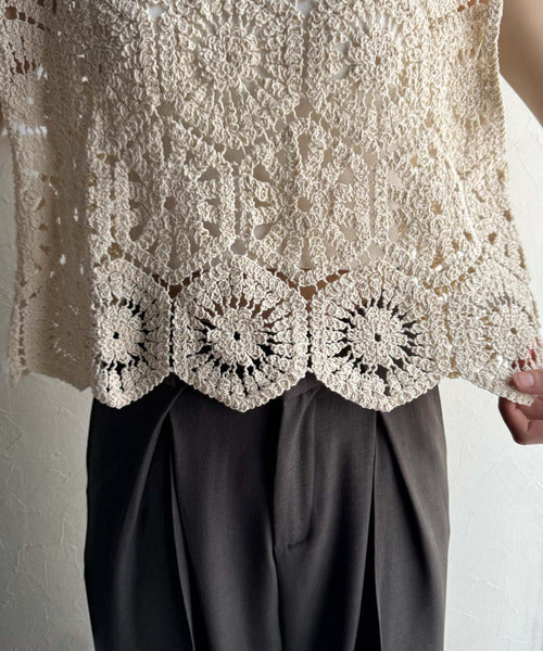 レトロ感漂うトレンド♪前後2WAYクロシェレースフレンチスリーブカットソー ce1110114