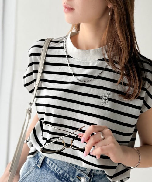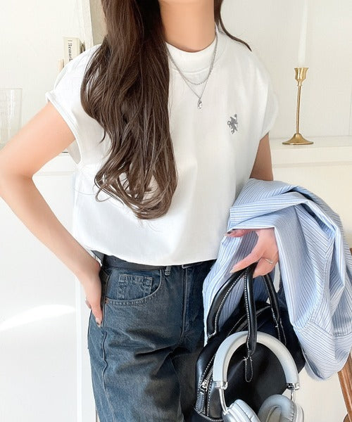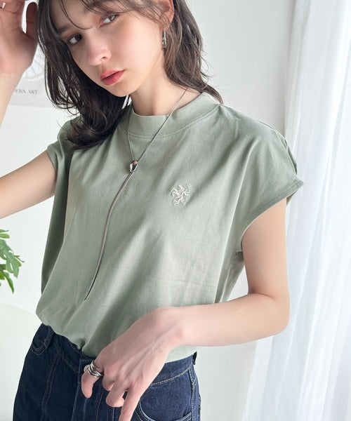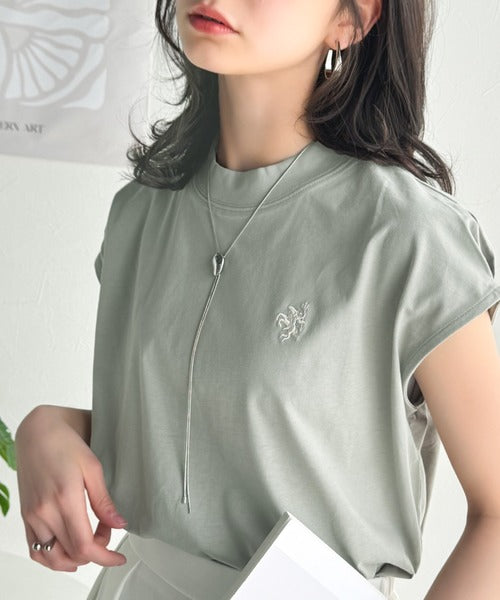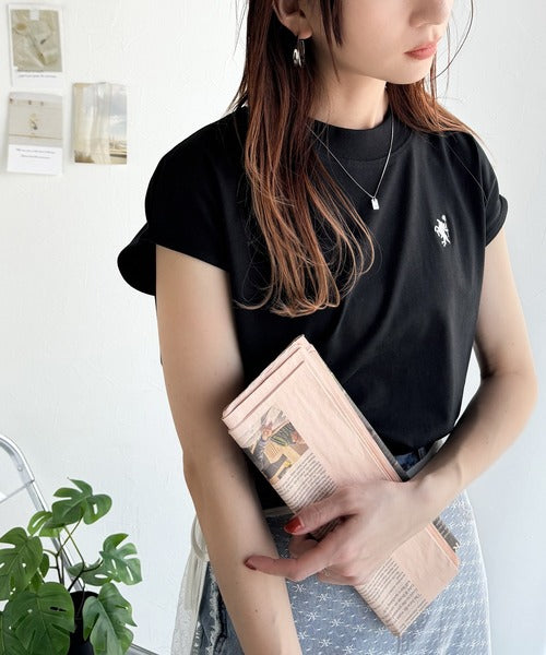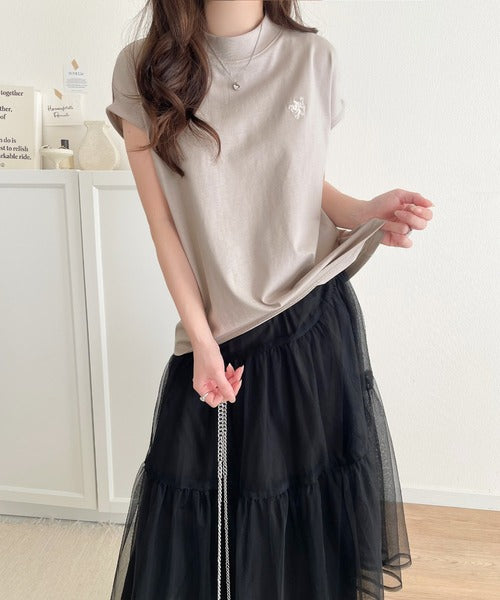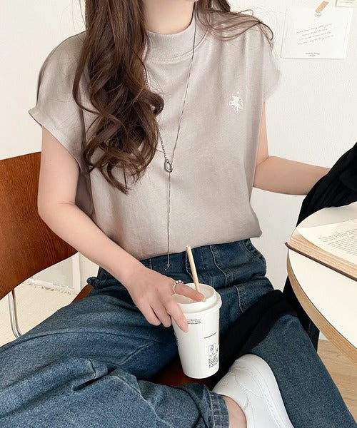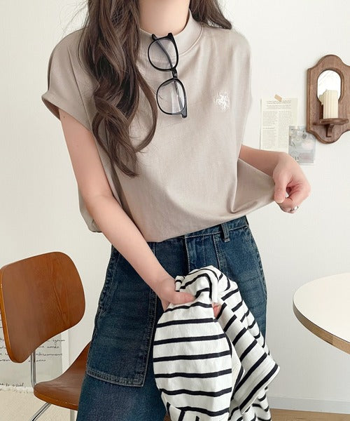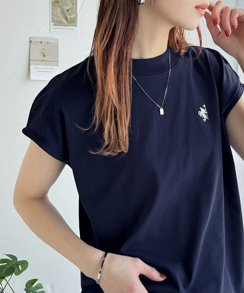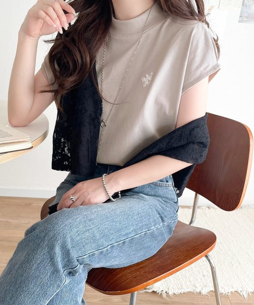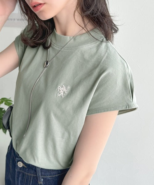 大人女子の上品ベーシック。綿100%シルケットモックネックフレンチTシャツ(刺繍) ce1260395