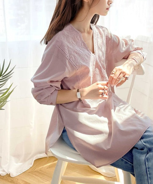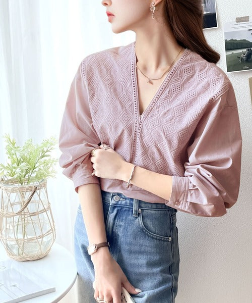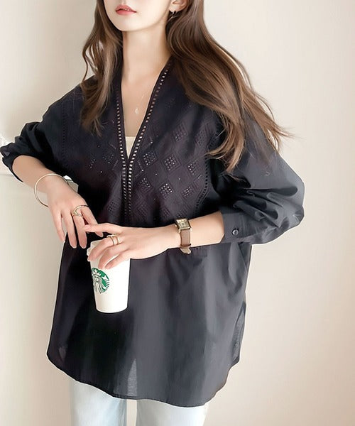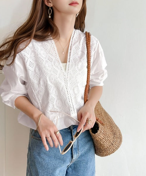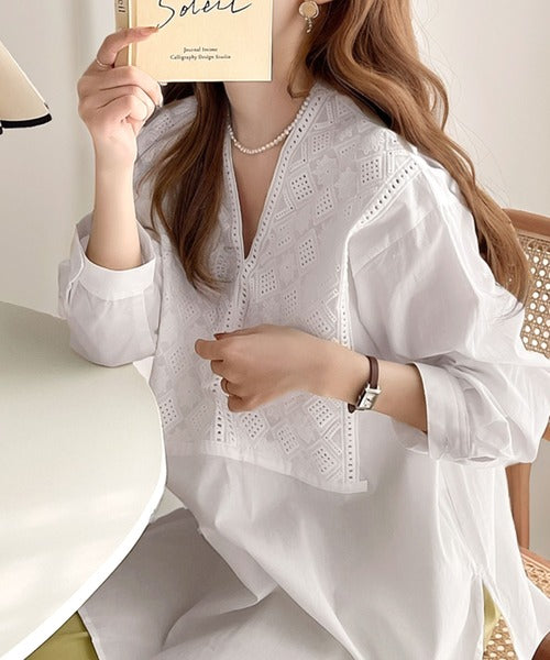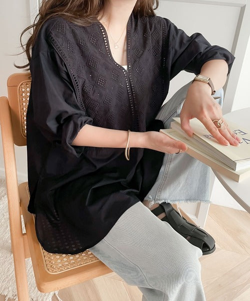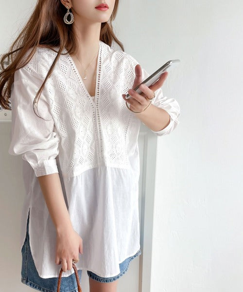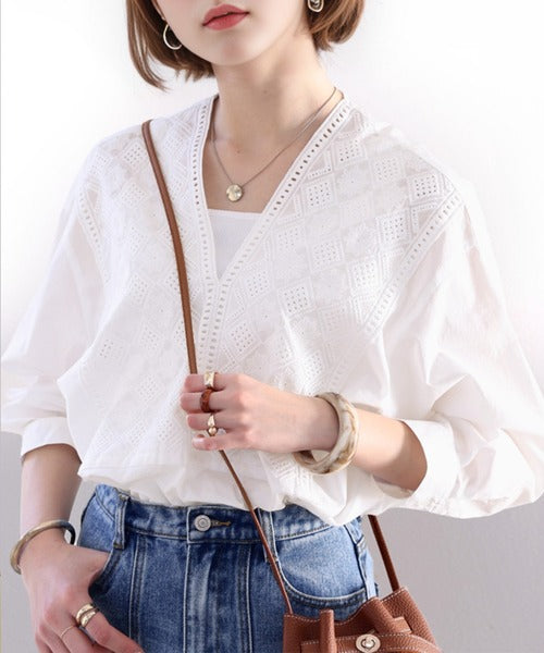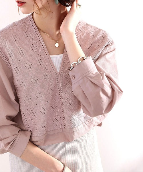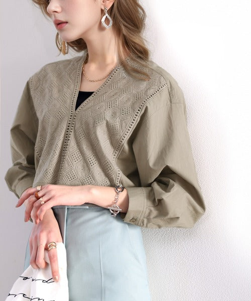 胸元を刺繍生地に切り替えた、エンブロイダリーブラウス。