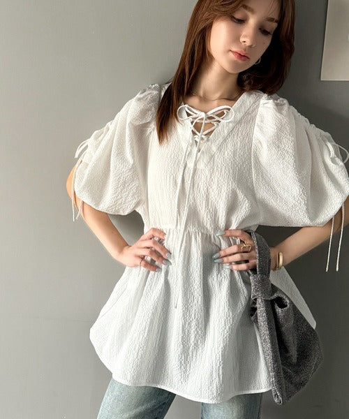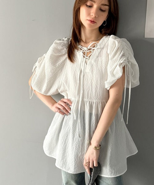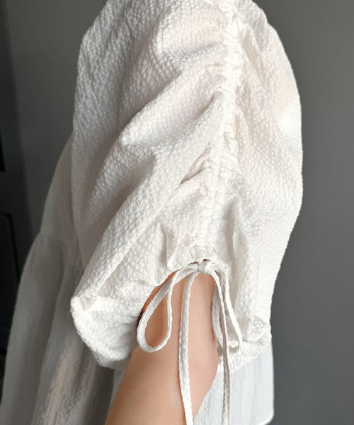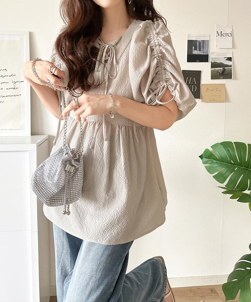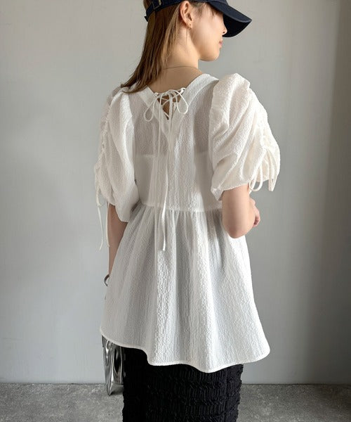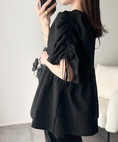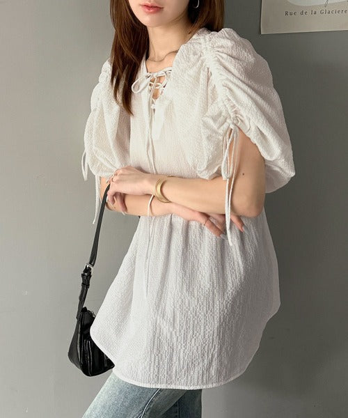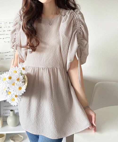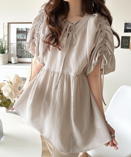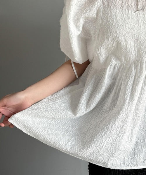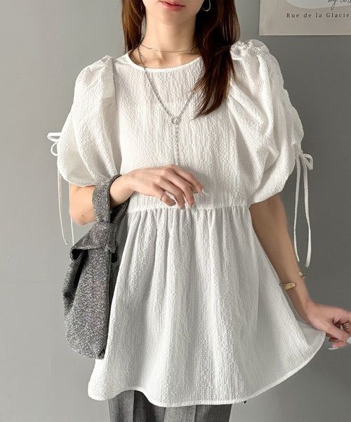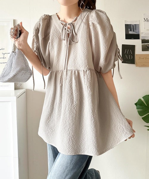 柔らかなシアサッカー素材で仕立てた、ギャザーパフスリーブのチュニックブラウス。