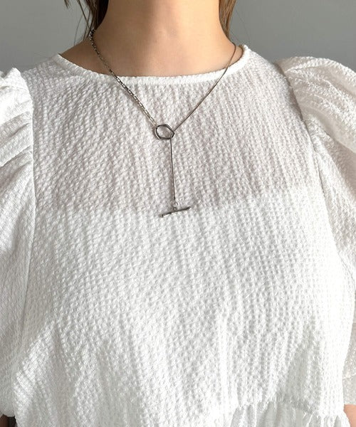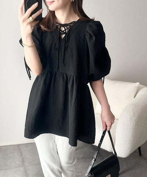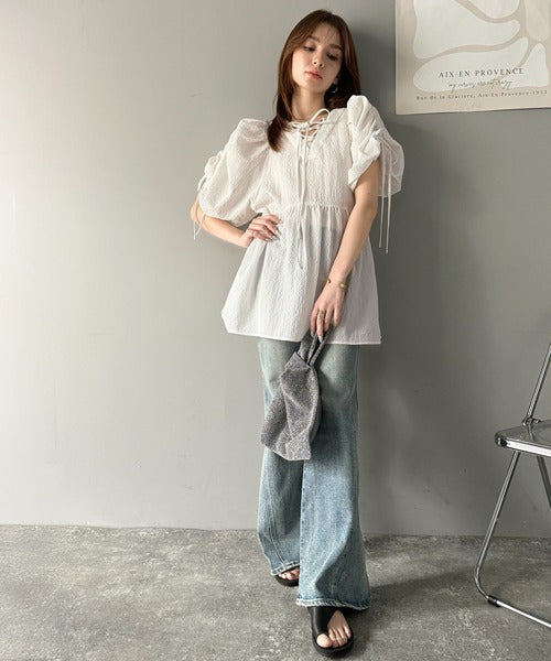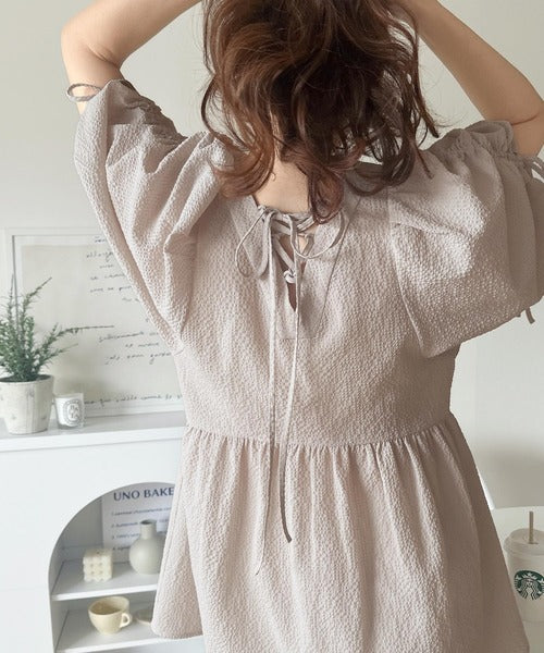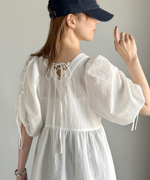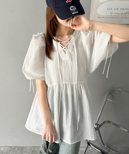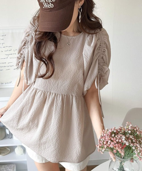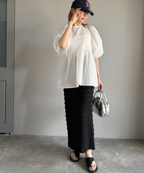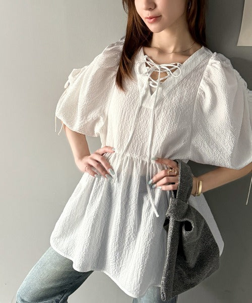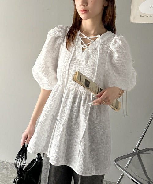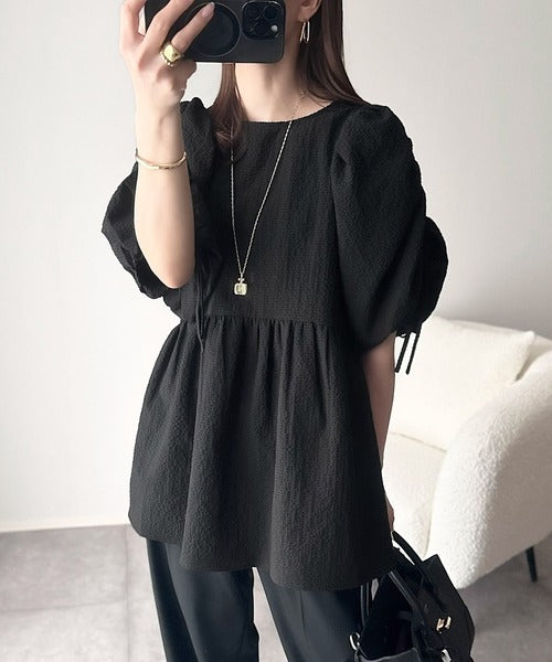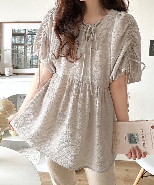 柔らかなシアサッカー素材で仕立てた、ギャザーパフスリーブのチュニックブラウス。