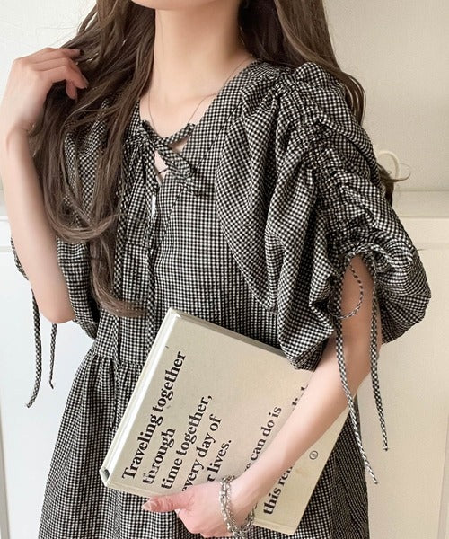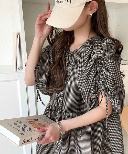 肩のリボンギャザーで袖丈をお好みに調節可能です♪