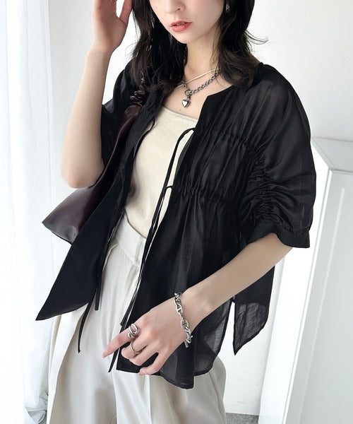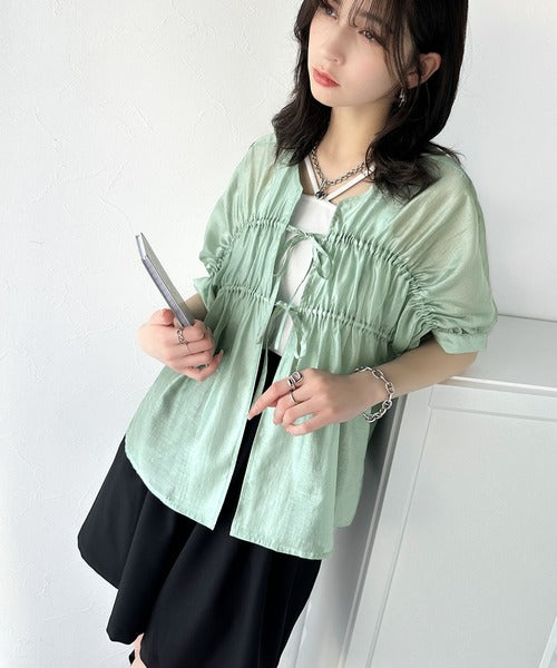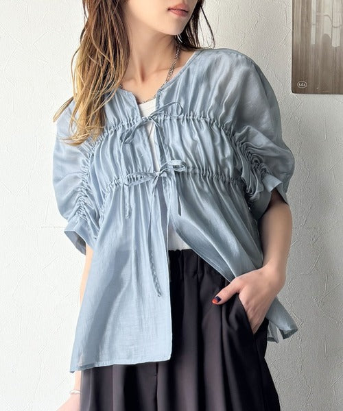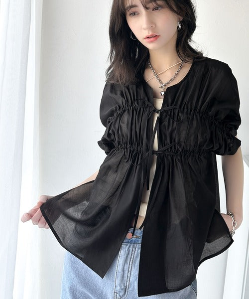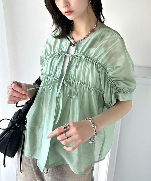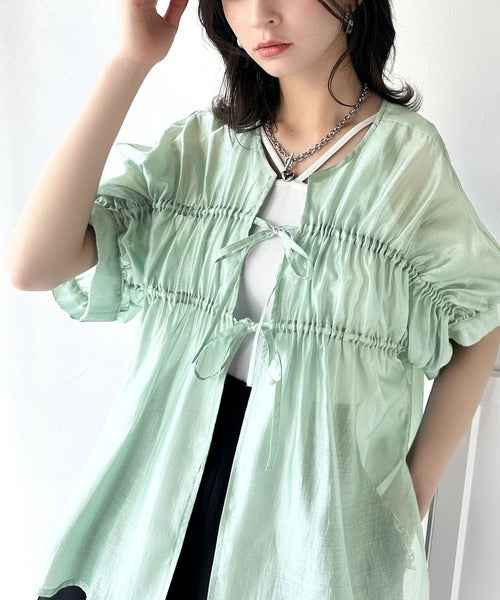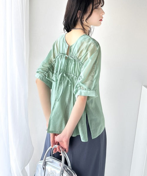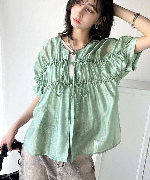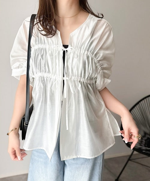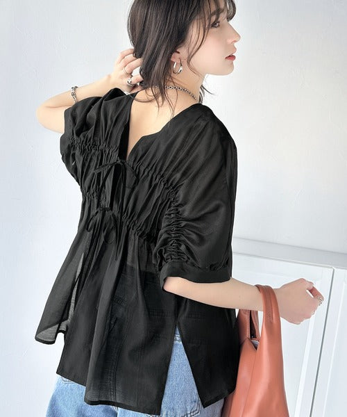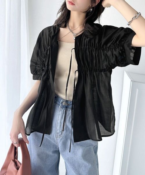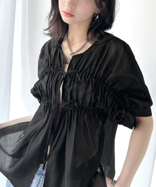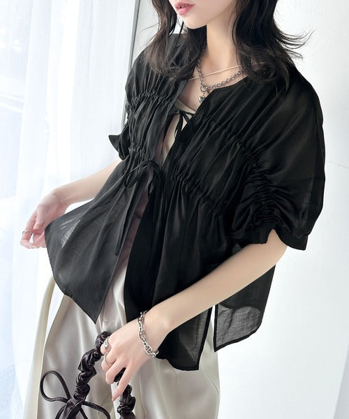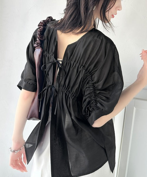 高級感漂う春夏の必需品!前後2WAYギャザーリボンシアーブラウス(半袖) ce1110097