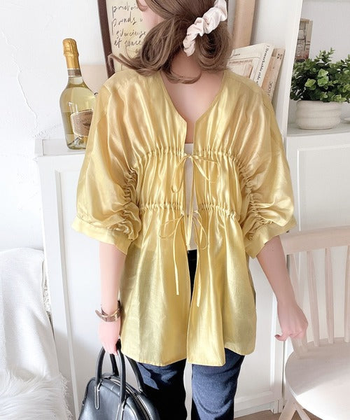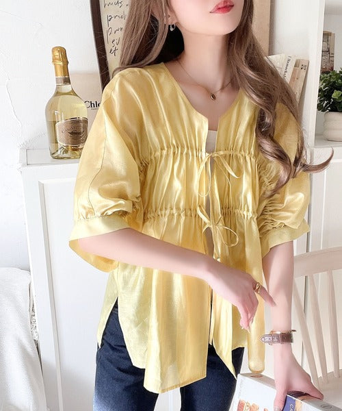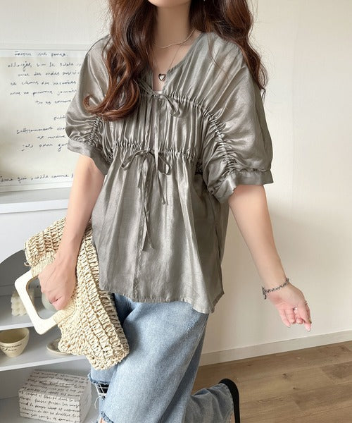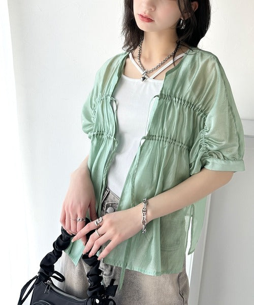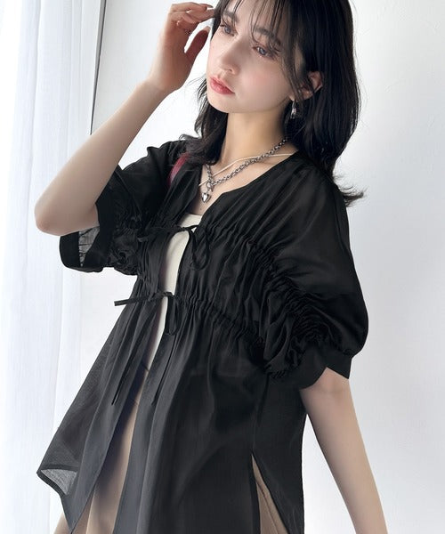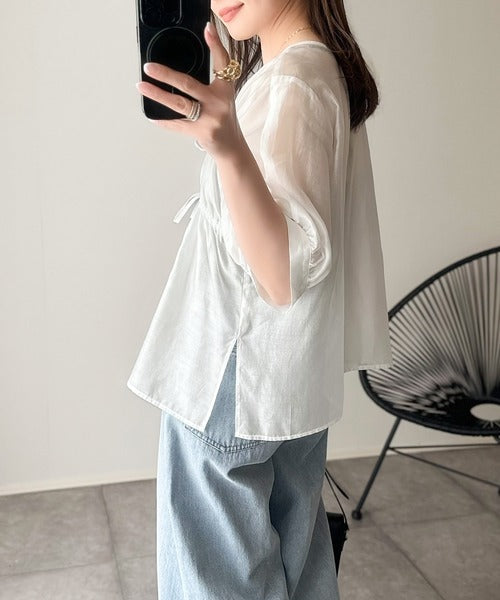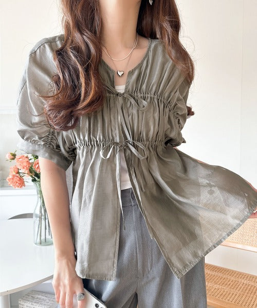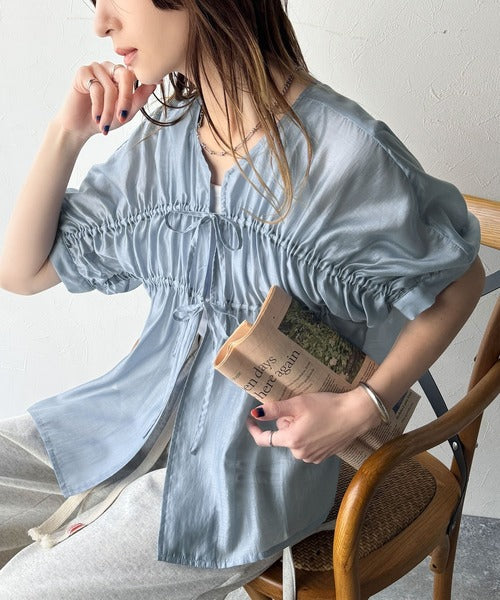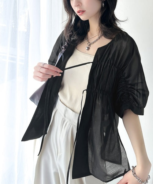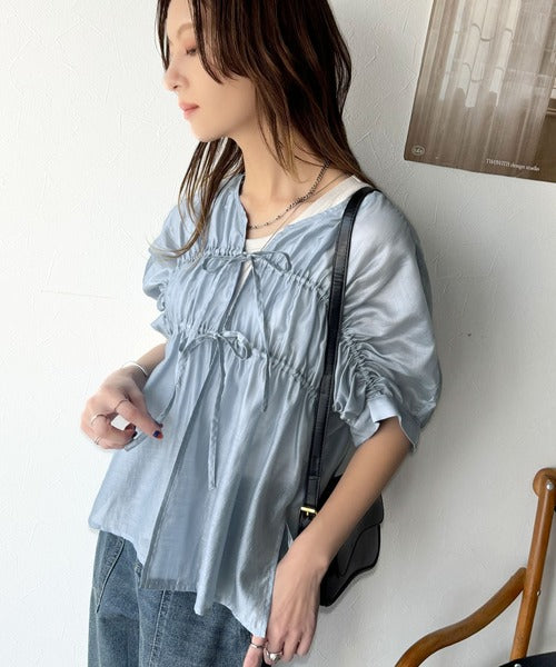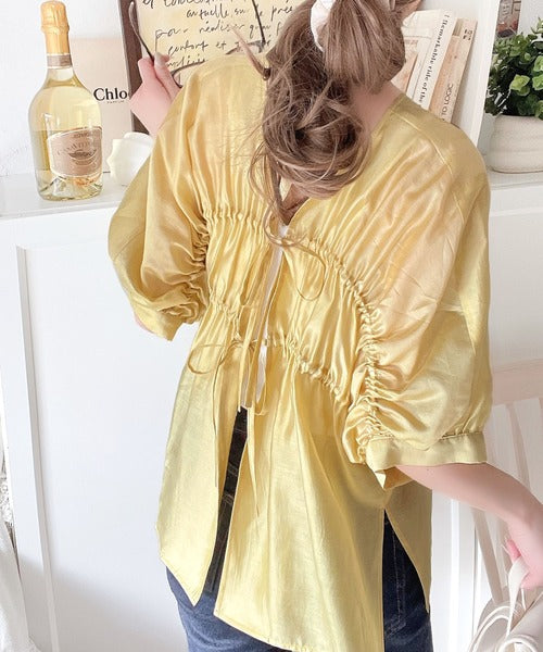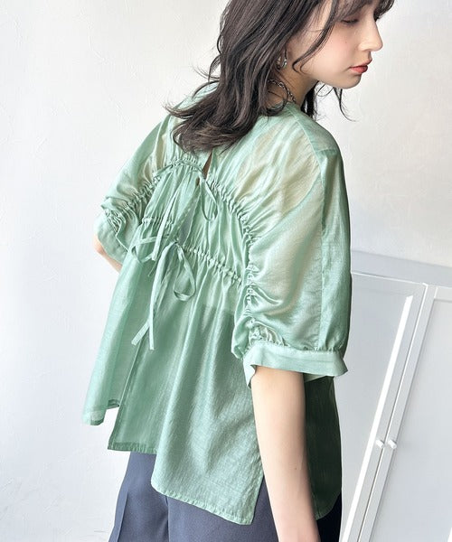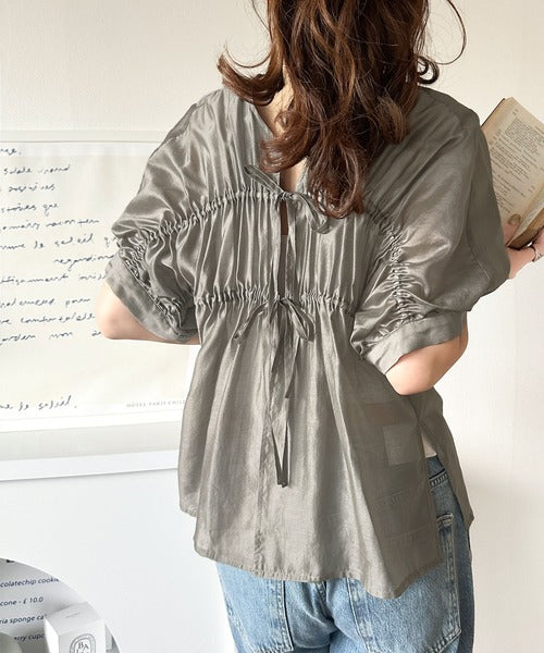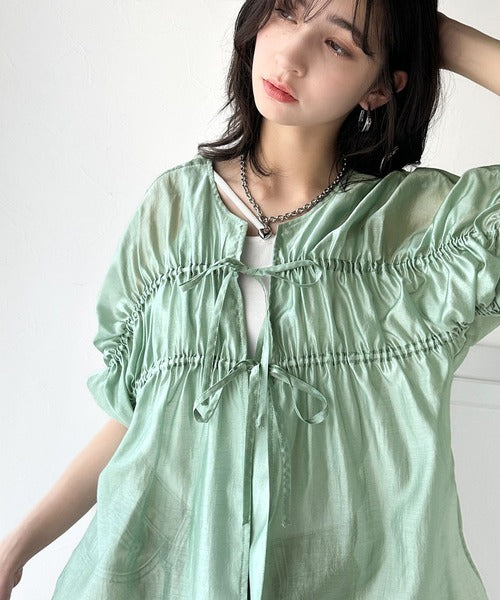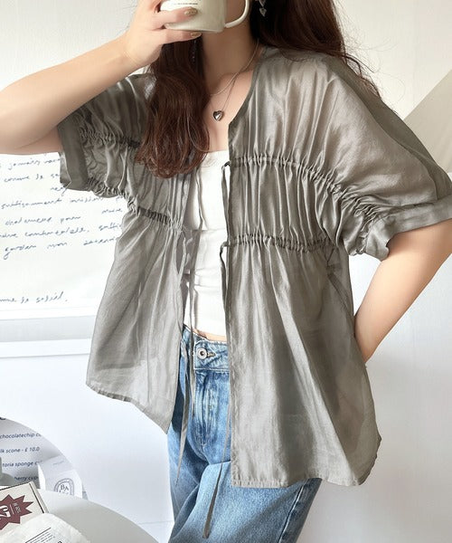高級感漂う春夏の必需品!前後2WAYギャザーリボンシアーブラウス(半袖) ce1110097