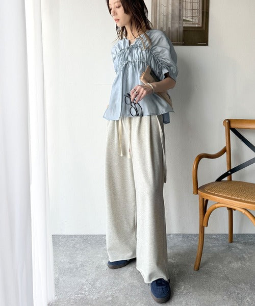 女性らしい甘さを引き立てるギャザーとリボンが魅力。