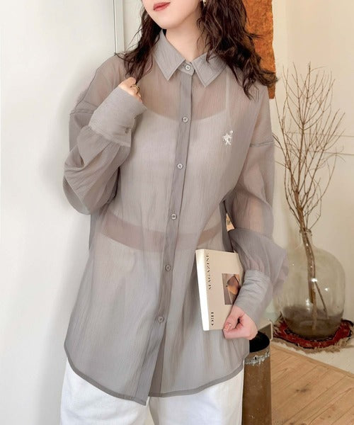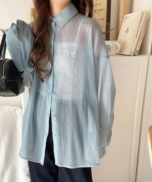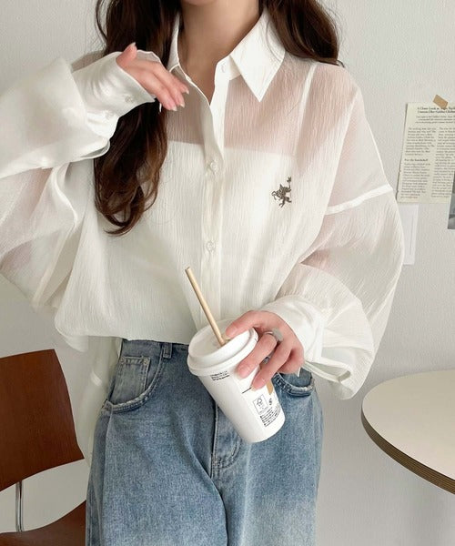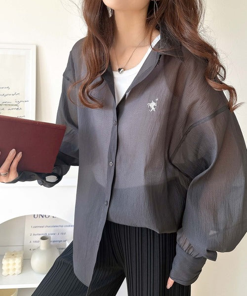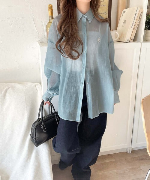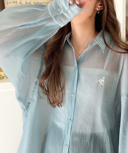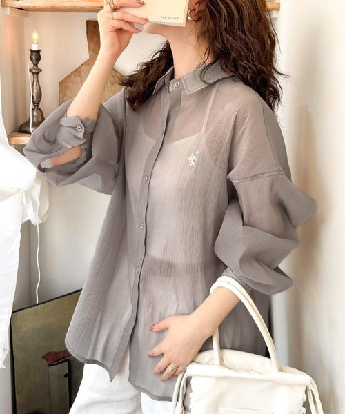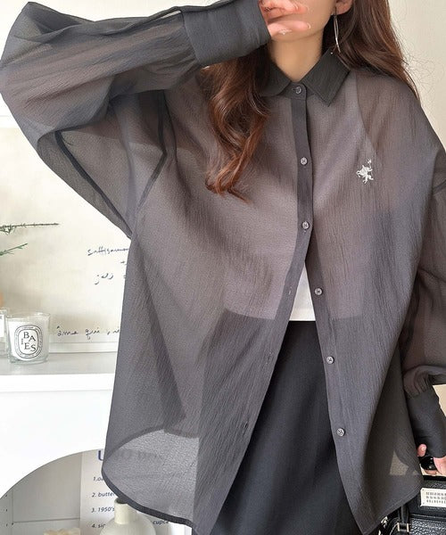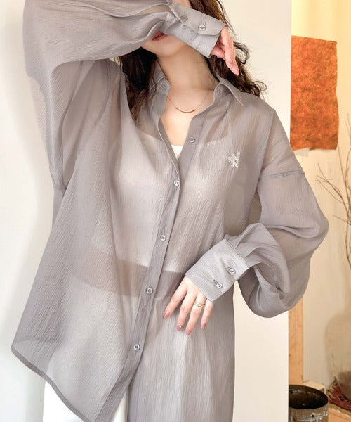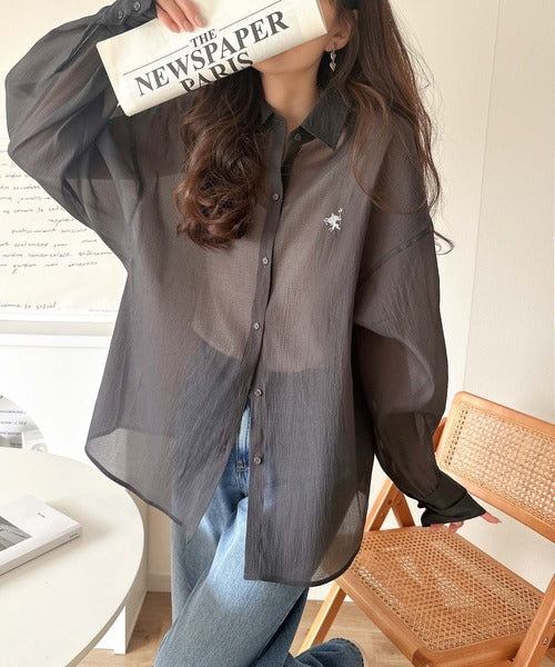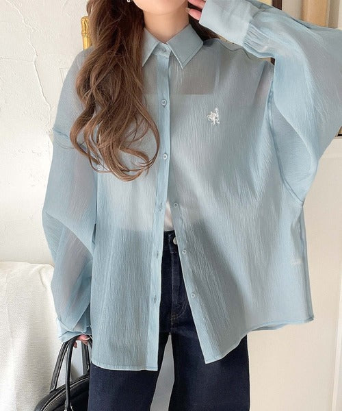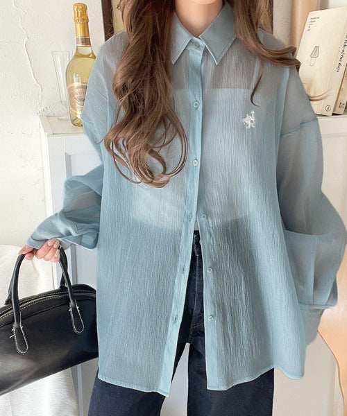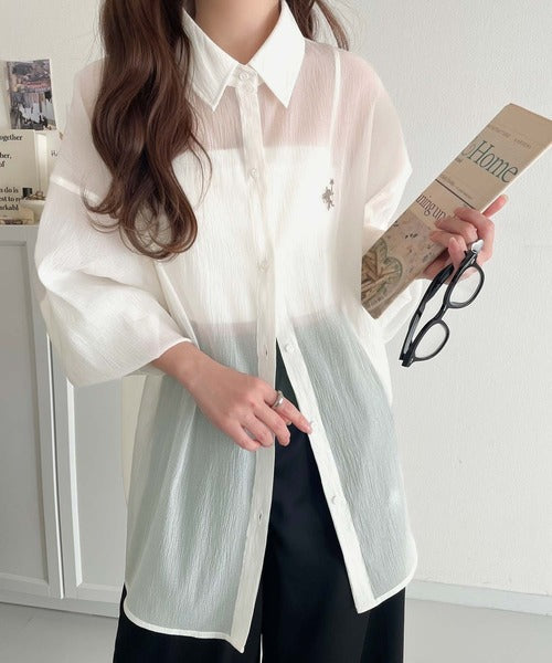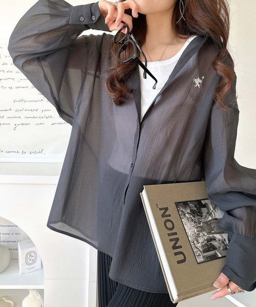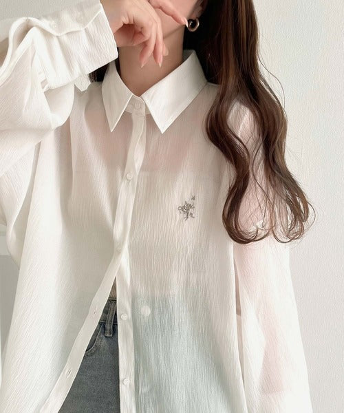 胸元にワンポイント刺繍付きのカジュアルシャツをシアーな素材で上品に仕上げた1枚。