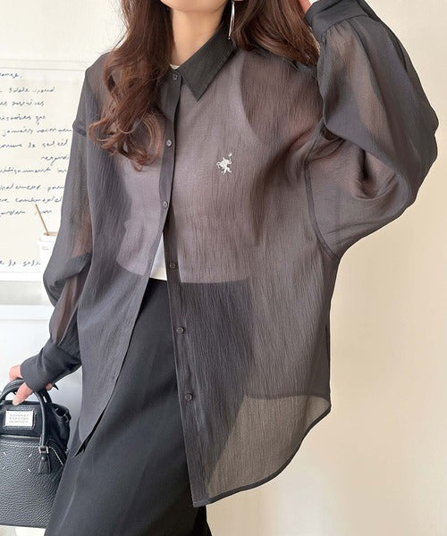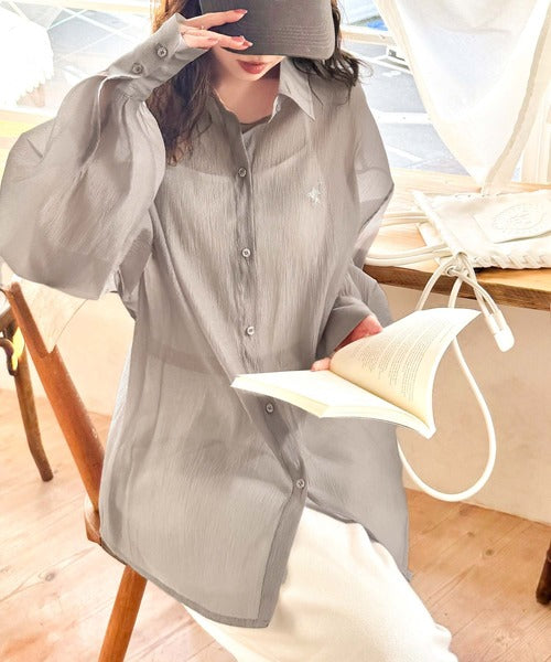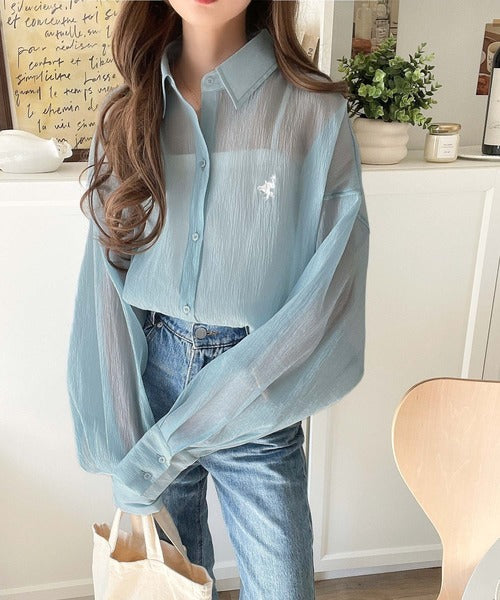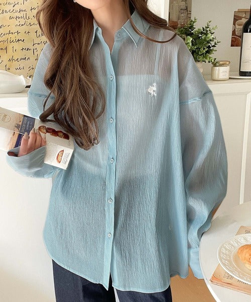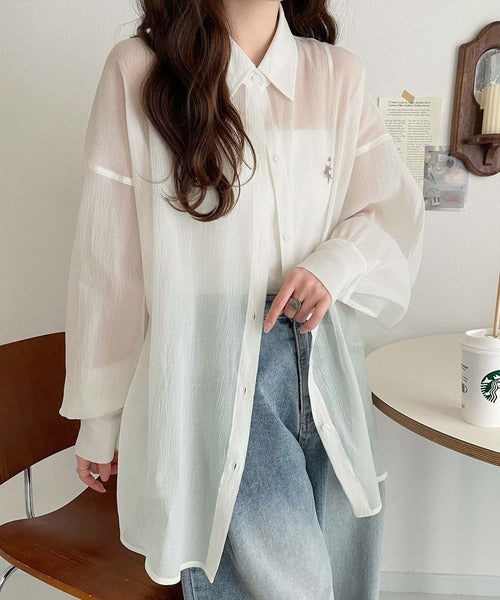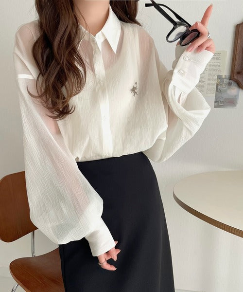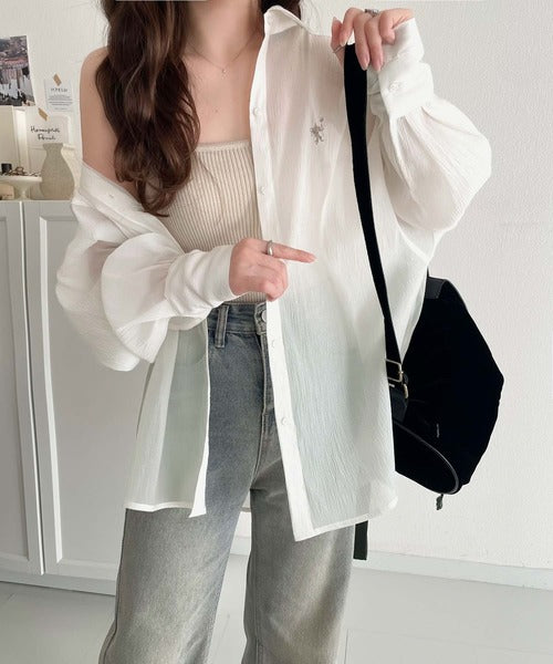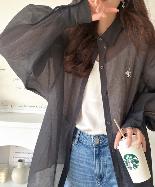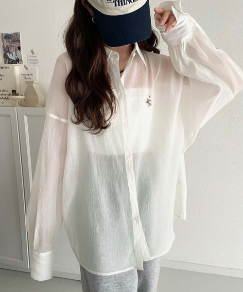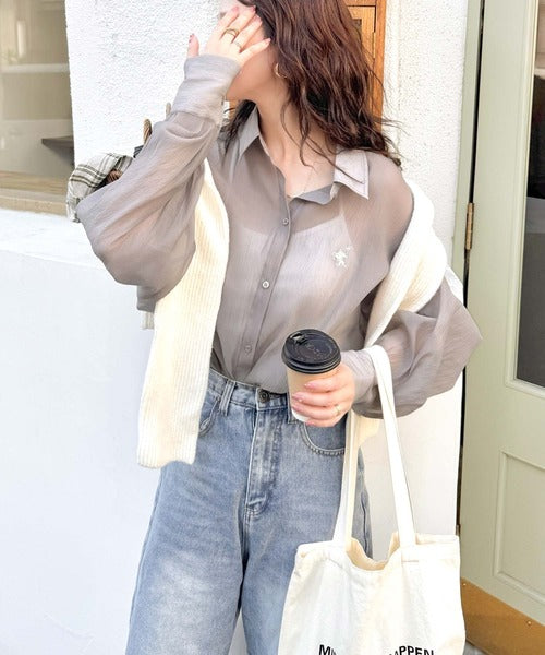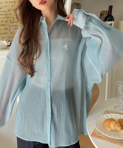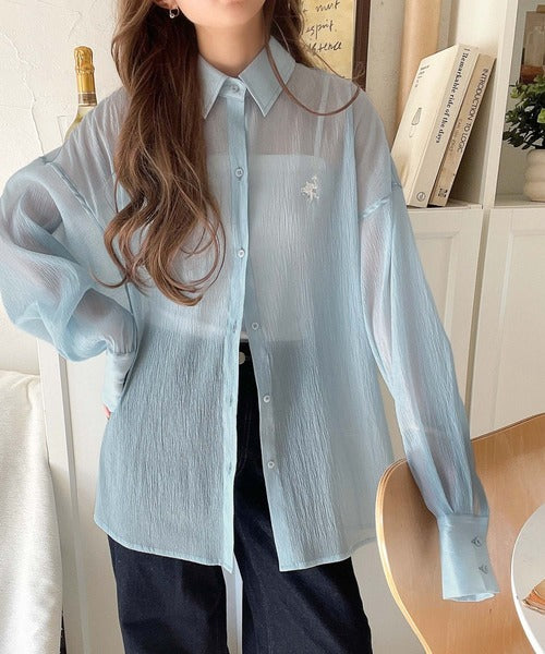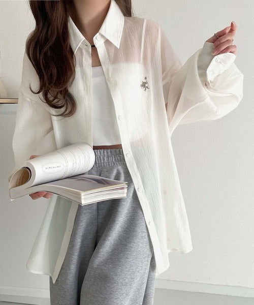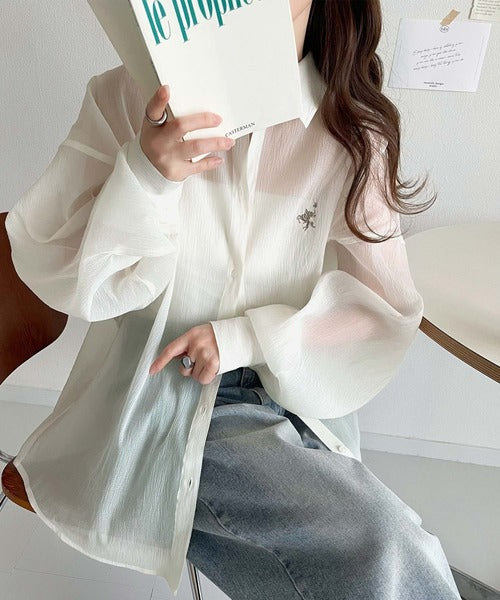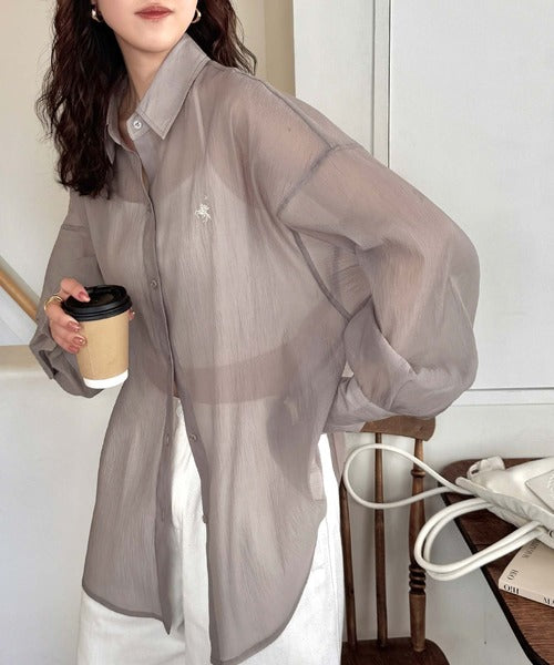胸元にワンポイント刺繍付きのカジュアルシャツをシアーな素材で上品に仕上げた1枚。