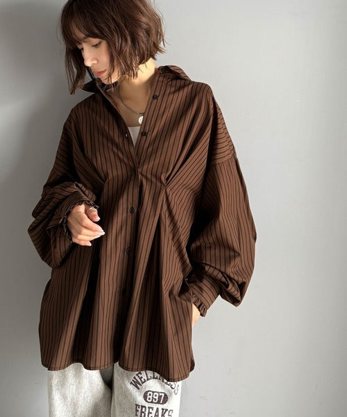 甘さ控えめの好バランス◎ウエストタック袖フリルビッグ長袖シャツ(無地・チェック柄・ストライプ柄アソート) ce1110127