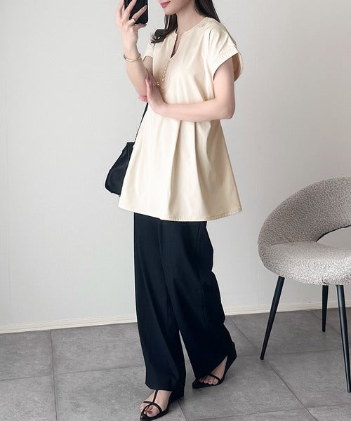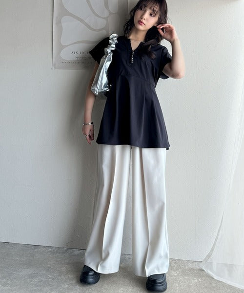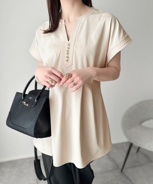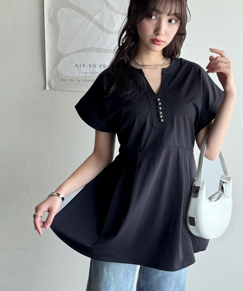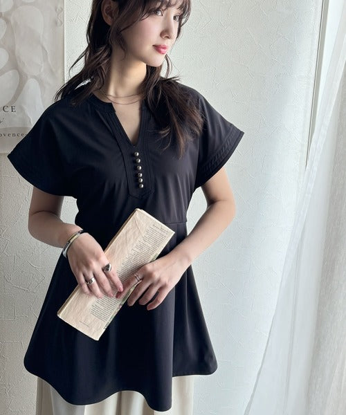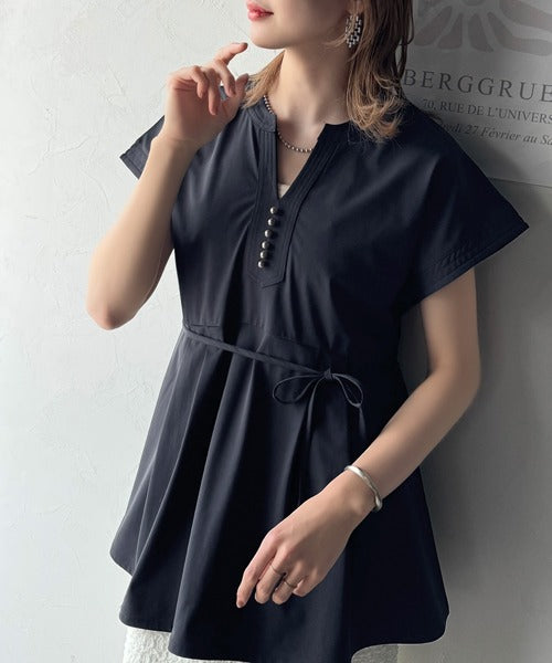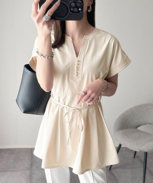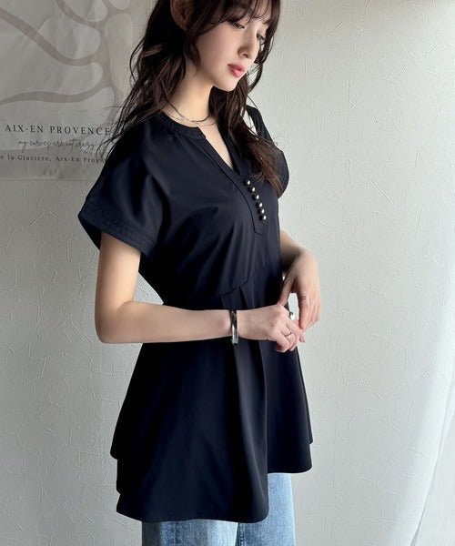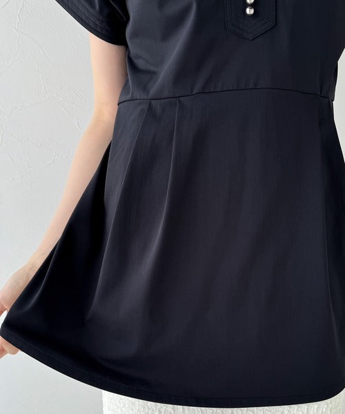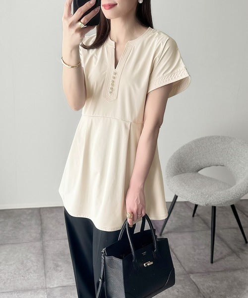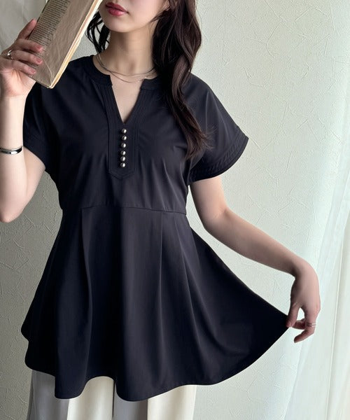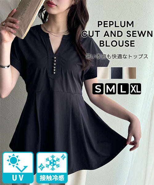上品さを纏う。胸元パールボタン使いペプラム半袖カットソーブラウス(接触冷感・遮熱・UVカット) ce1260410