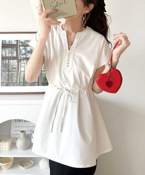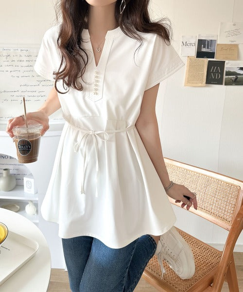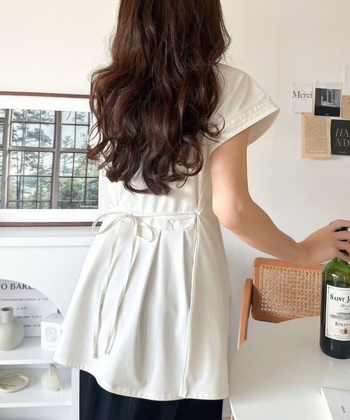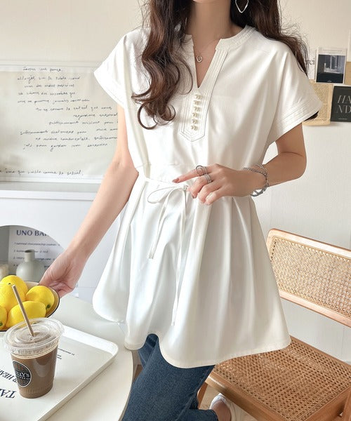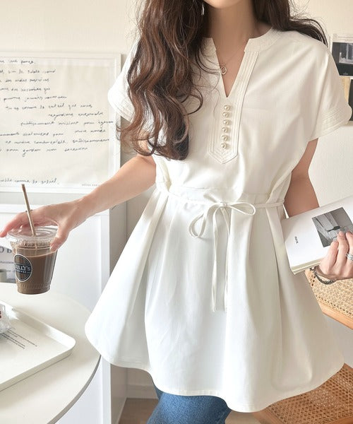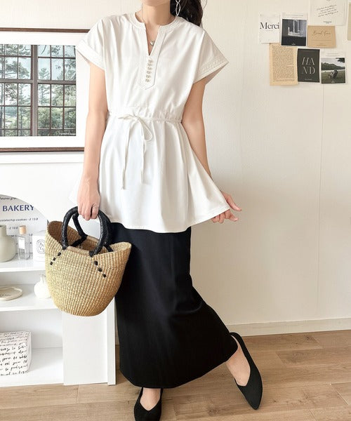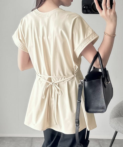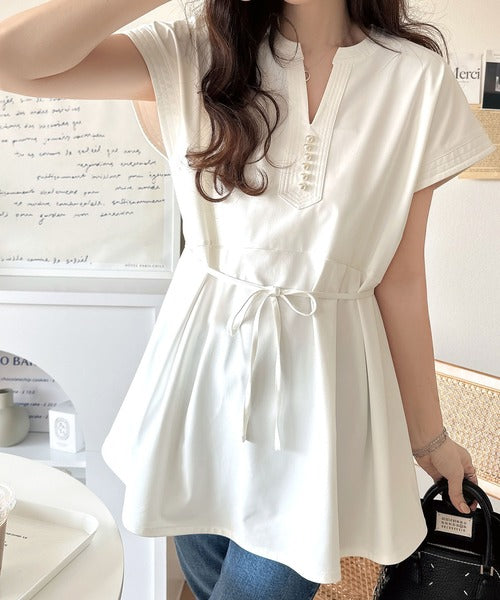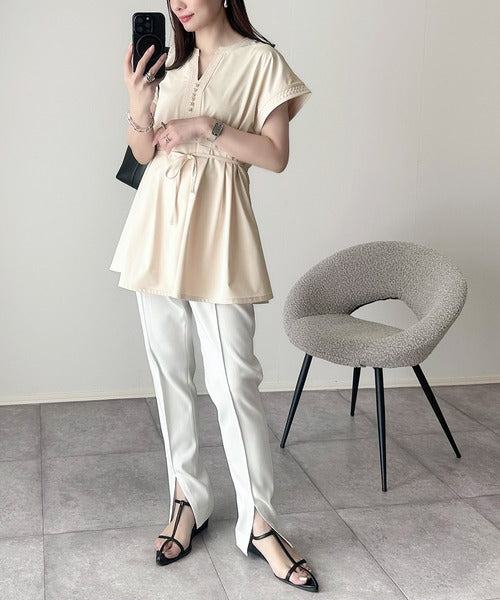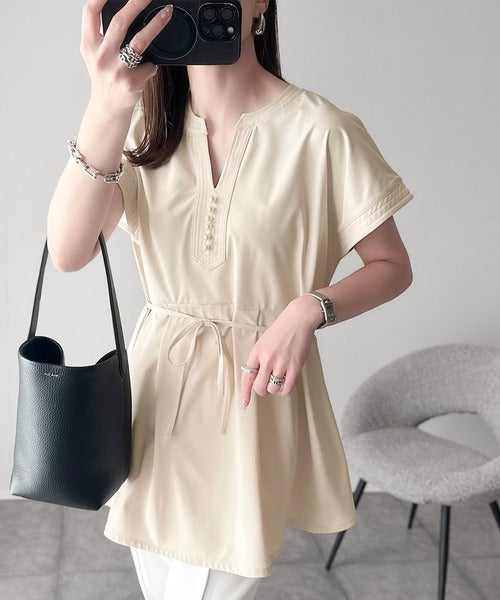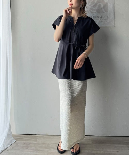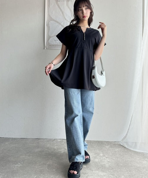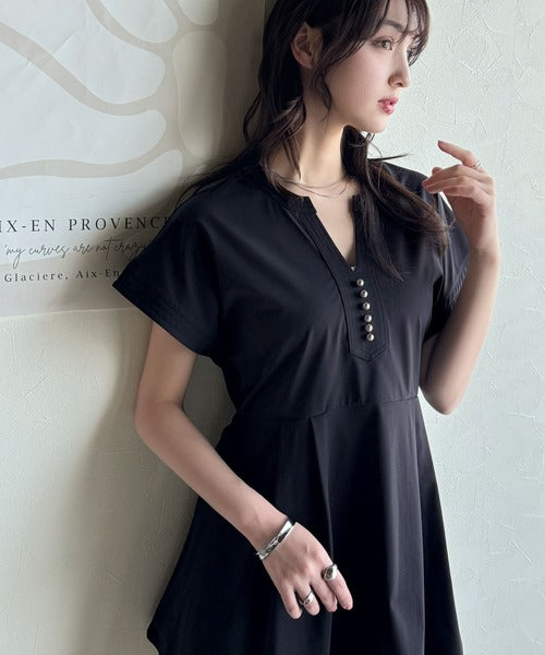 上品さを纏う。胸元パールボタン使いペプラム半袖カットソーブラウス(接触冷感・遮熱・UVカット) ce1260410