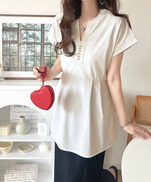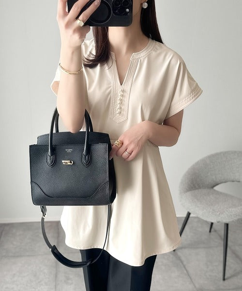 シンプルなブラウスながら、華やかさを感じさせるデザインで、