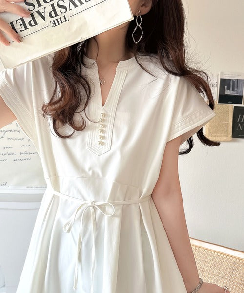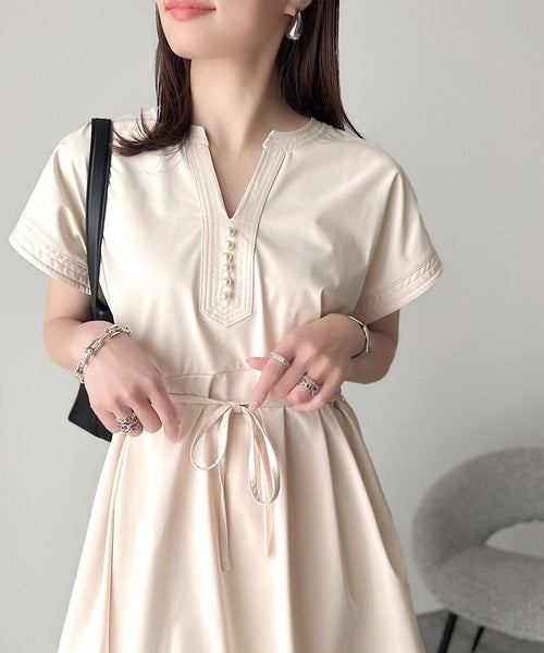 V字に開いた胸元にはパールが施され、上品さを引き立てます。