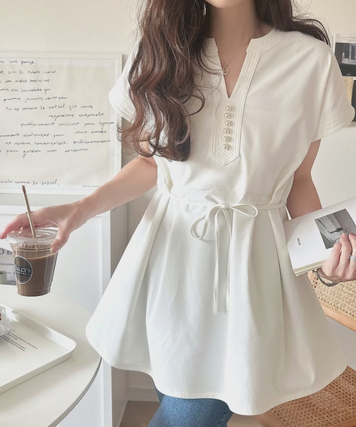 女性らしいシルエットが特徴のパールボタン使いペプラムブラウス。