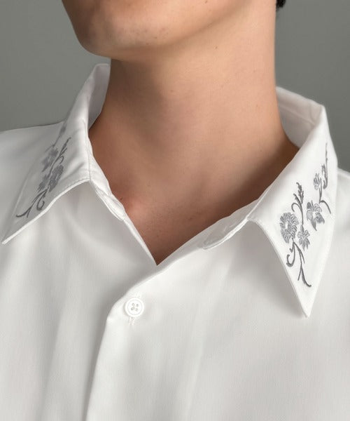 刺繍を配した衿と袖が特徴の印象派シャツ。