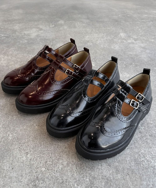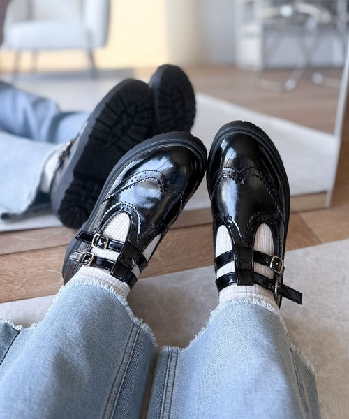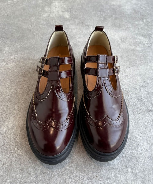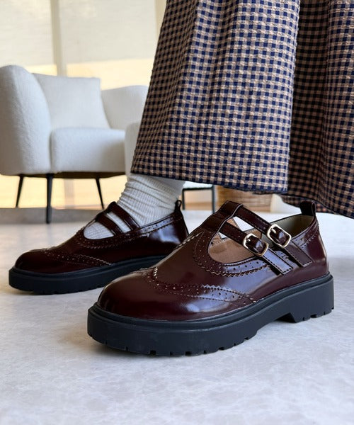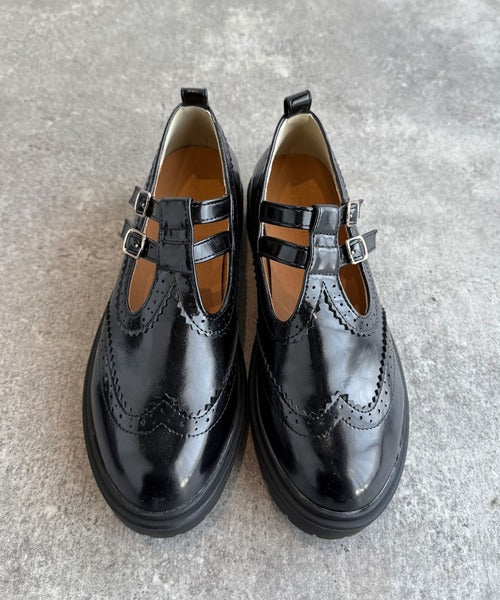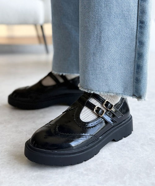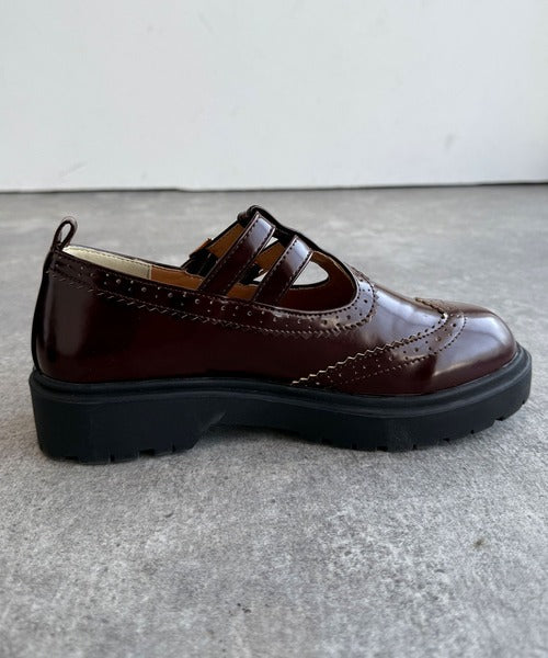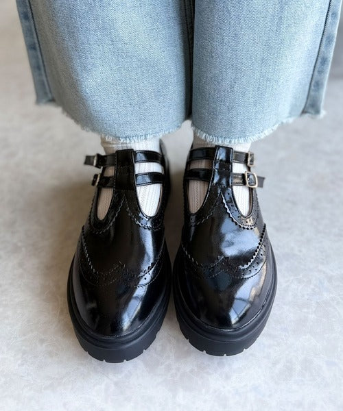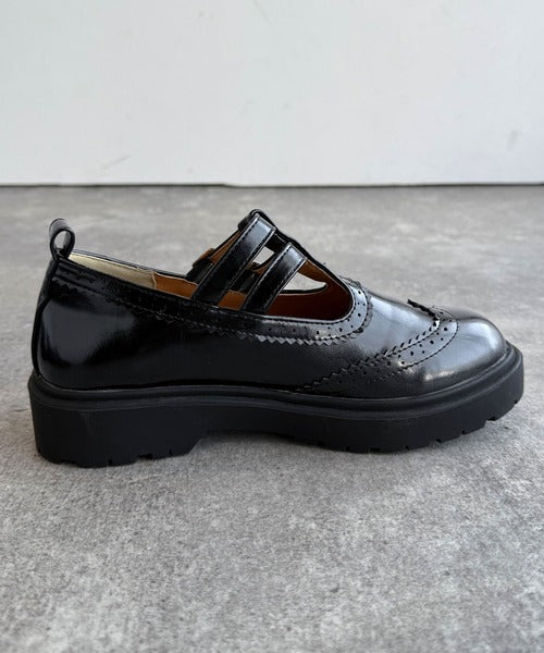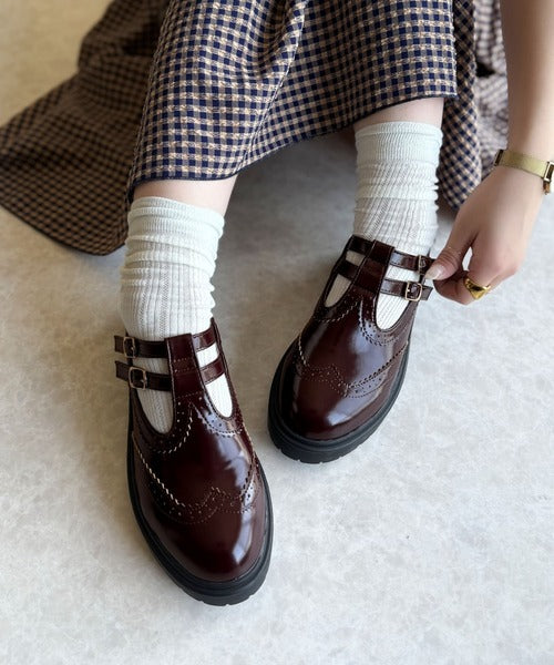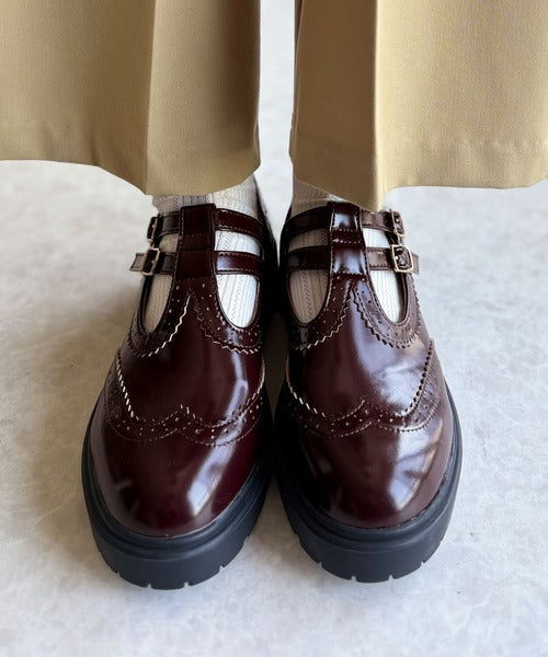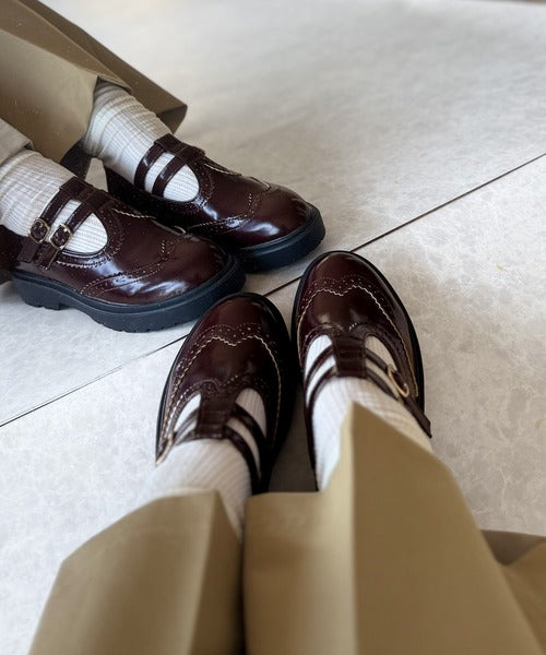 マニッシュなウイングチップと穴飾りに、Tストラップがほどよい抜け感をプラス◎
