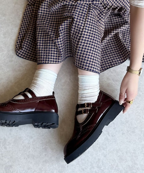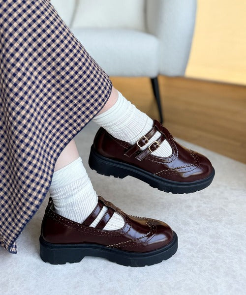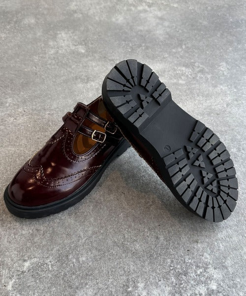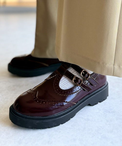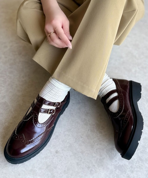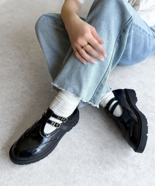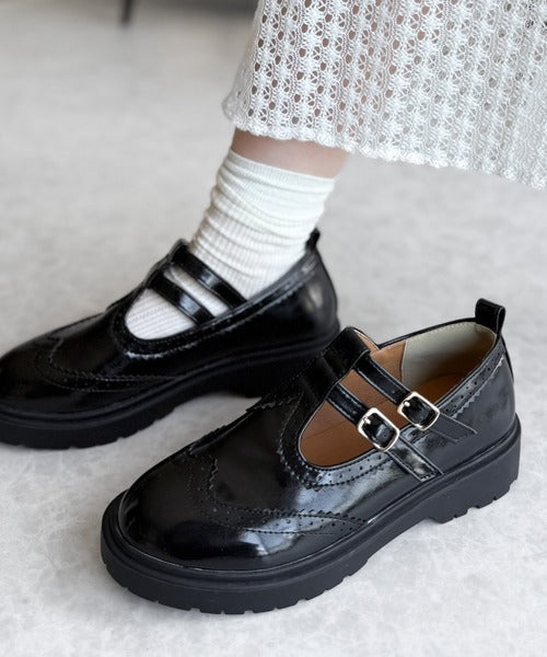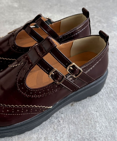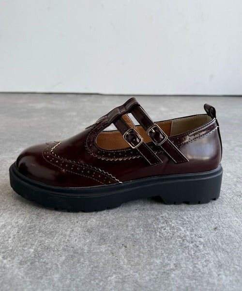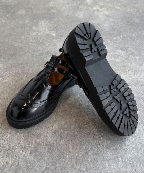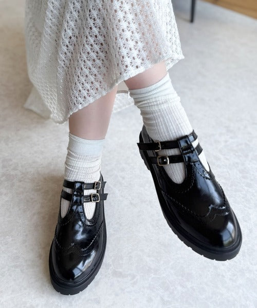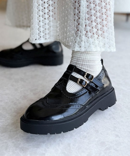 マニッシュなウイングチップと穴飾りに、Tストラップがほどよい抜け感をプラス◎