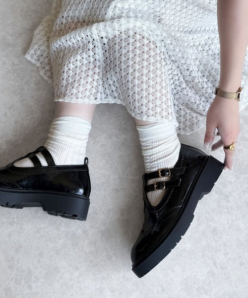 トレンド感たっぷりのダブルTストラップドレスシューズは、厚底ながらも重すぎず、