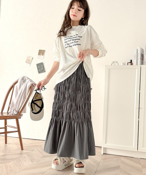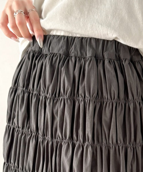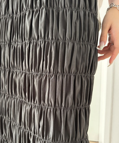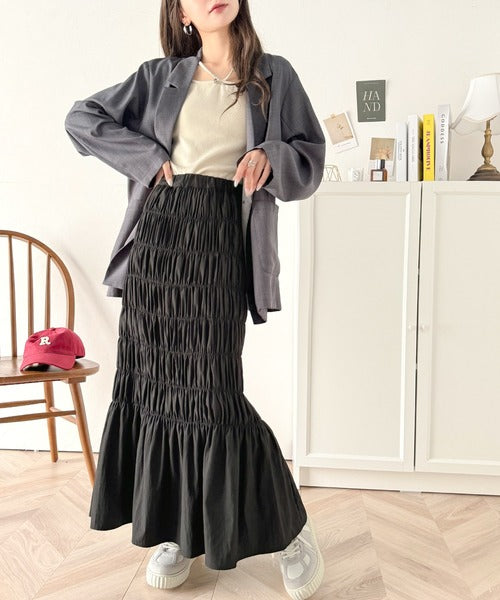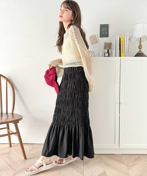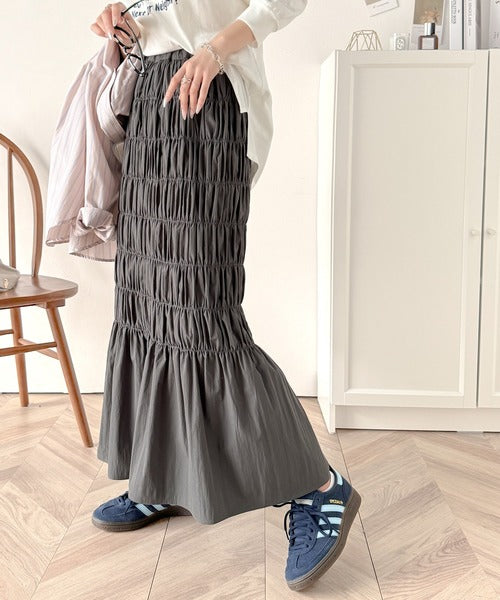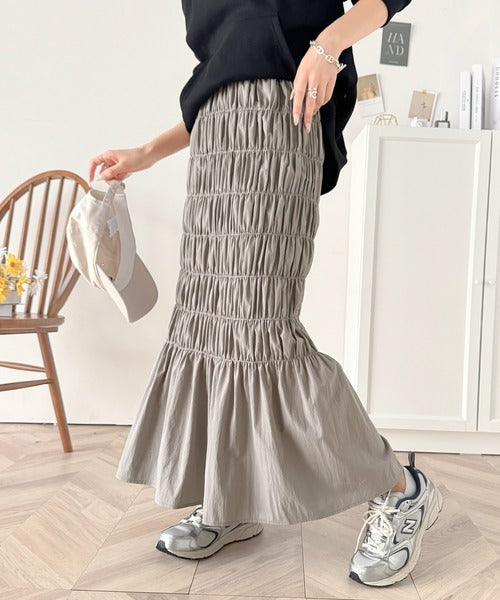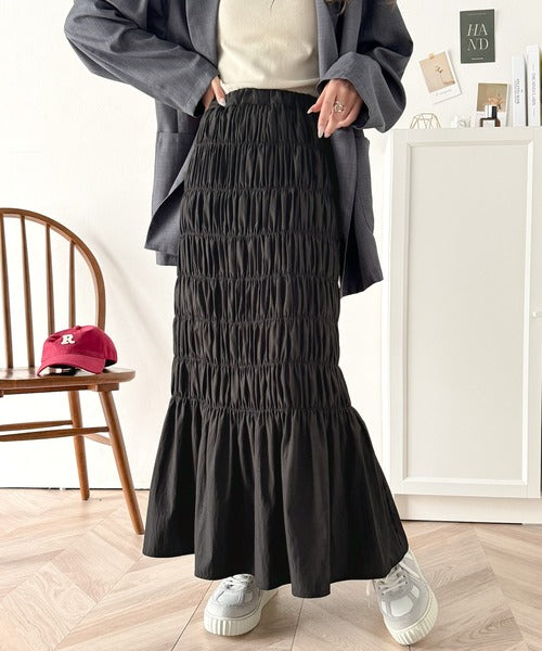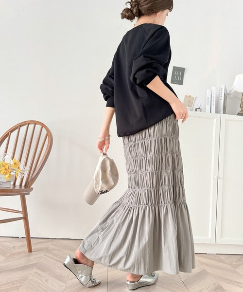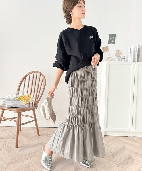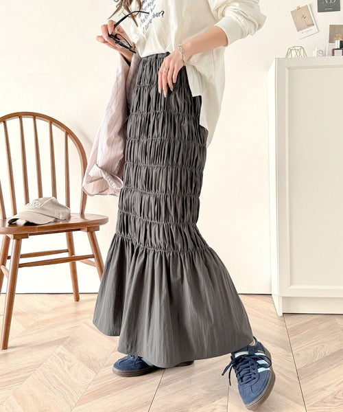 光沢感とシルエットが女性らしい。マーメイド風シャーリングナロースカート(ロング丈) ce1240053