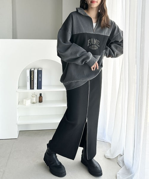 ファスナーでのスリットの調節や前後2wayで様々な着こなしを楽しめるため、