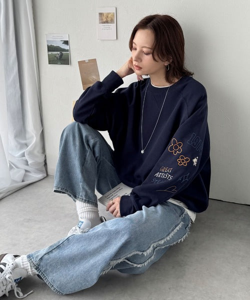 片袖にハンドメイド風の刺繍を多種施した裏起毛スウェット。