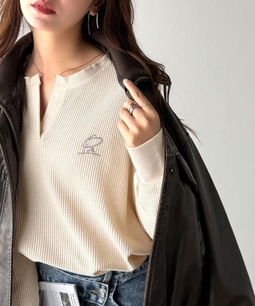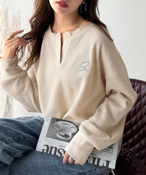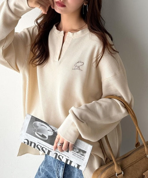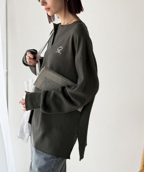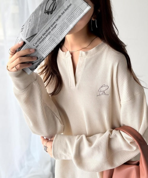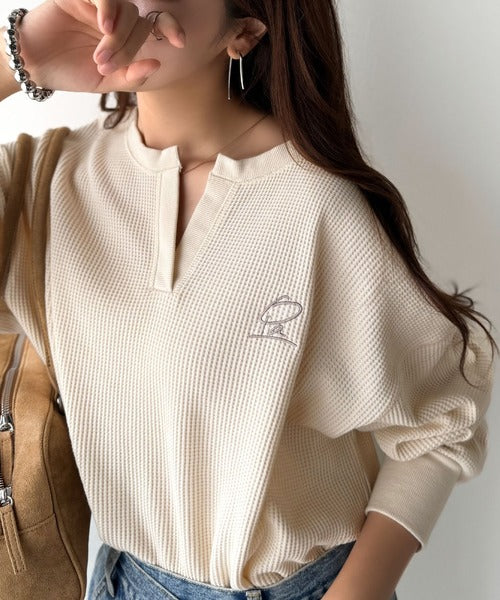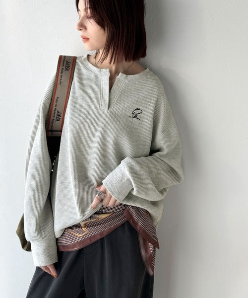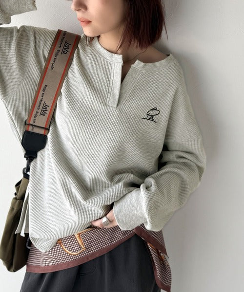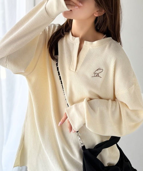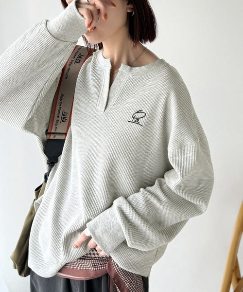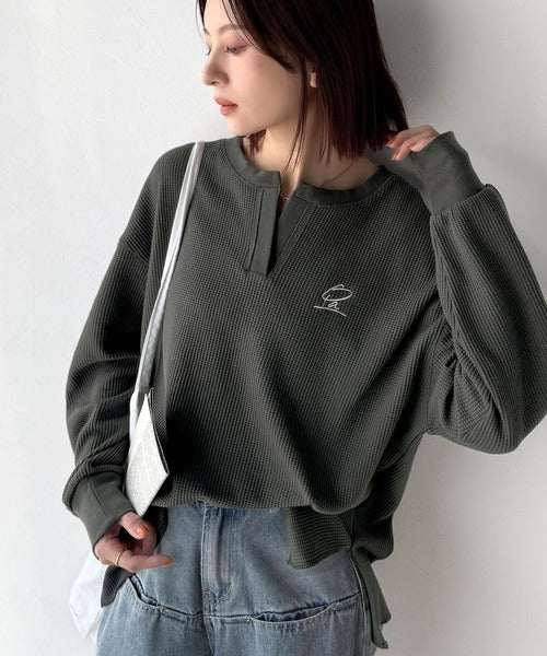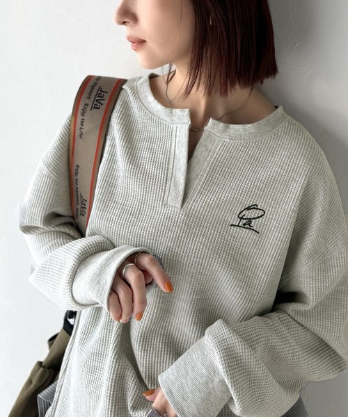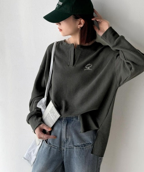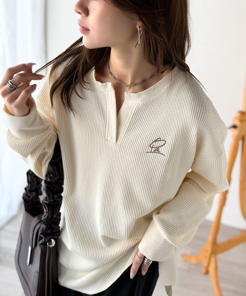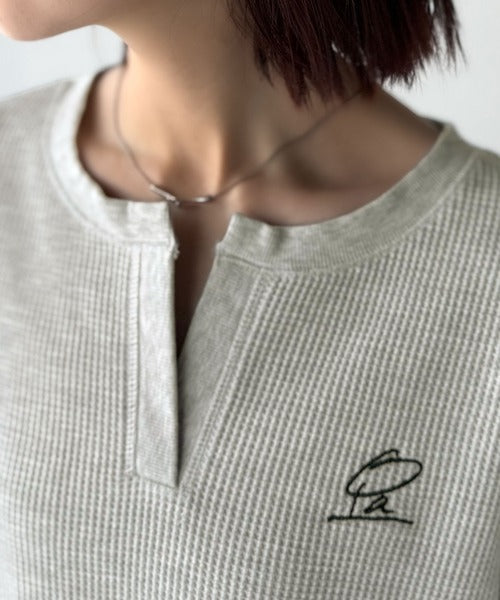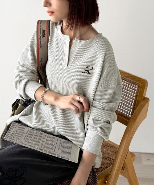 キーネックや胸刺繍のアクセントが、大人の抜け感を演出するワッフルロンTです♪