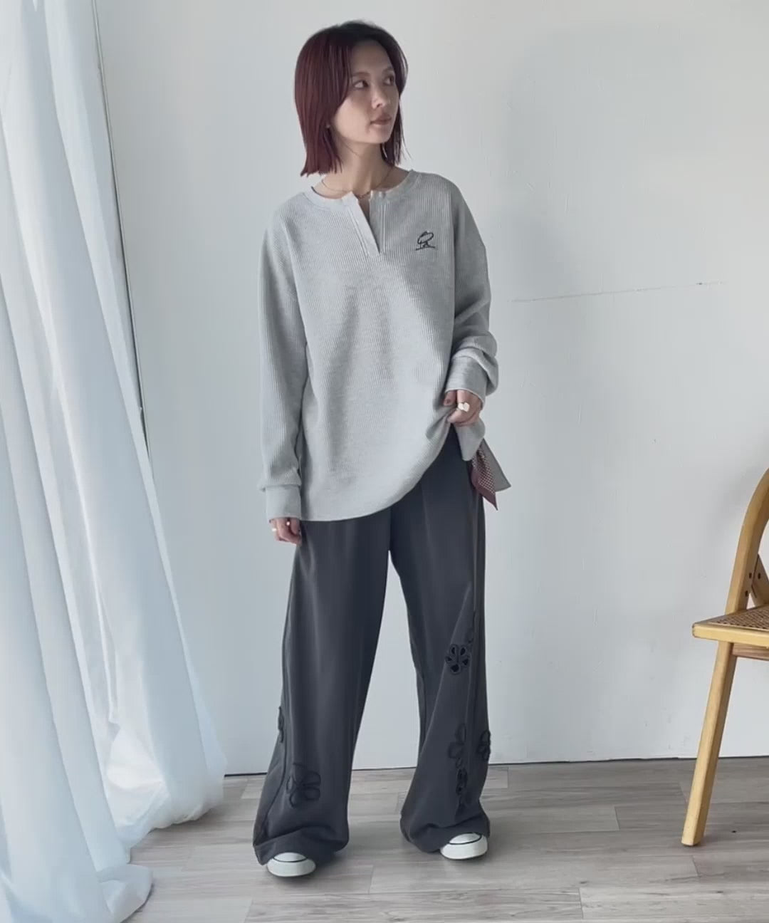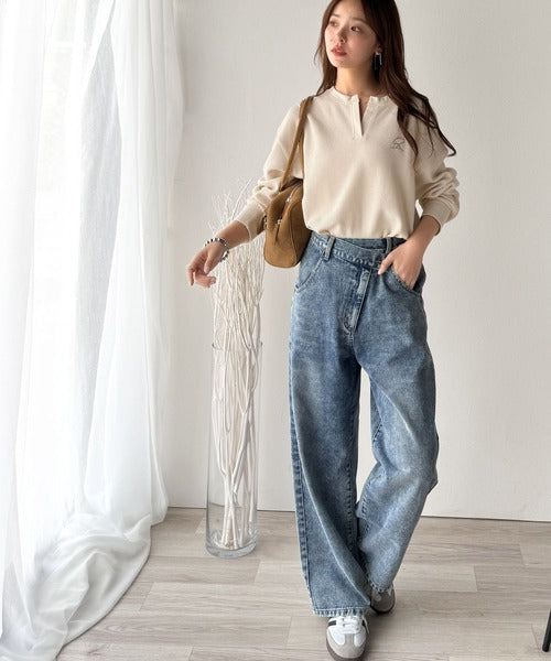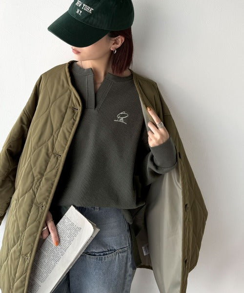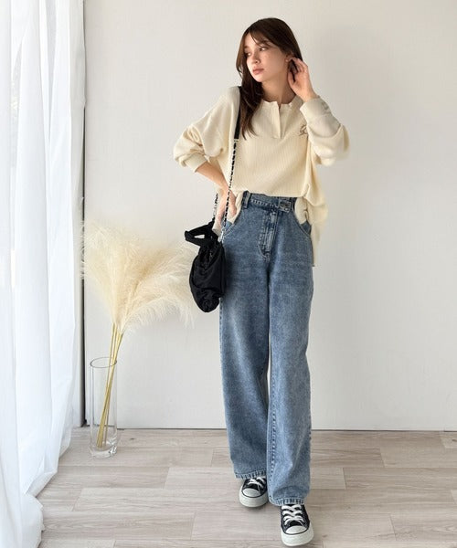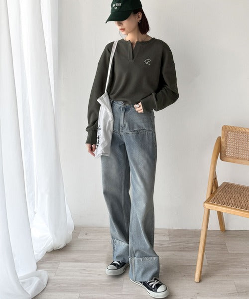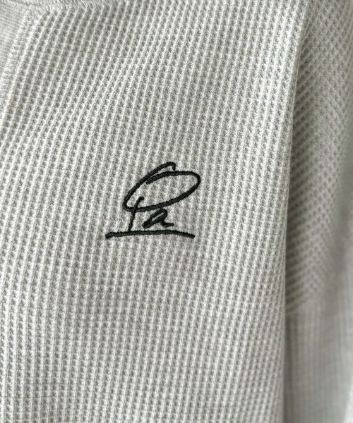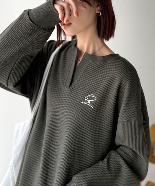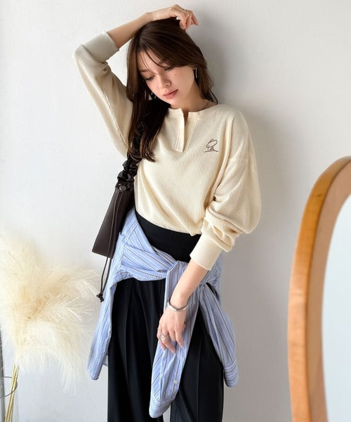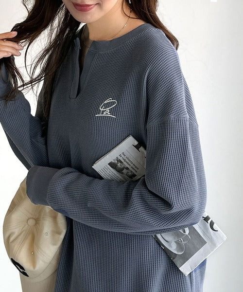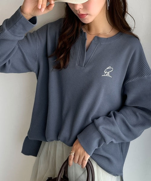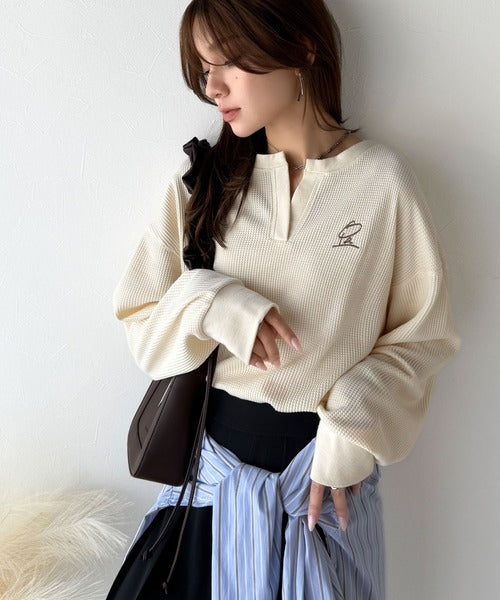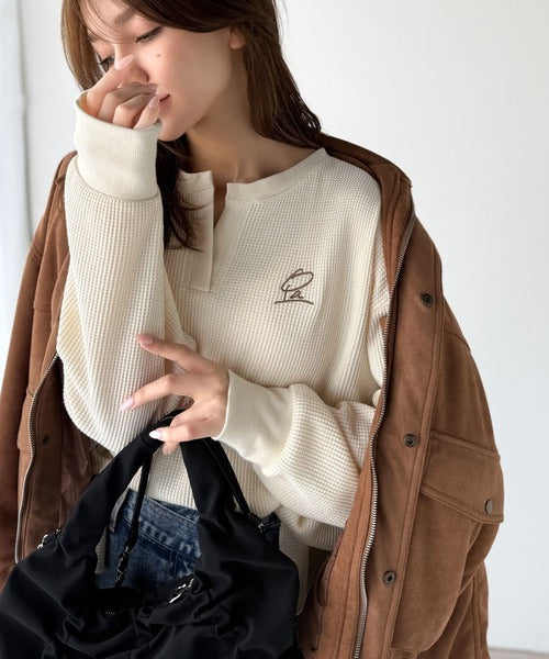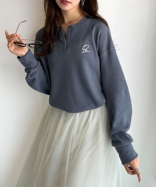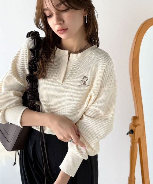 キーネックや胸刺繍のアクセントが、大人の抜け感を演出するワッフルロンTです♪