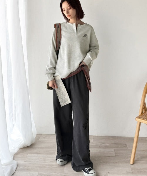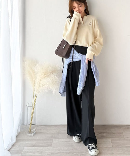 胸元刺繍×キーネックでこなれた雰囲気に。