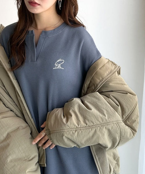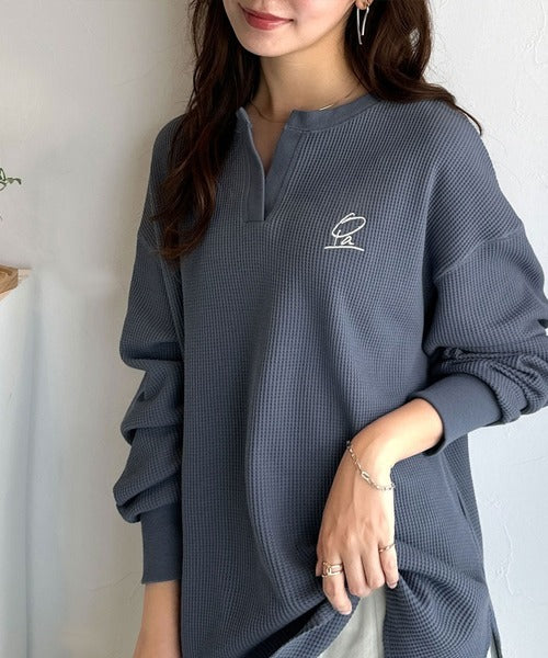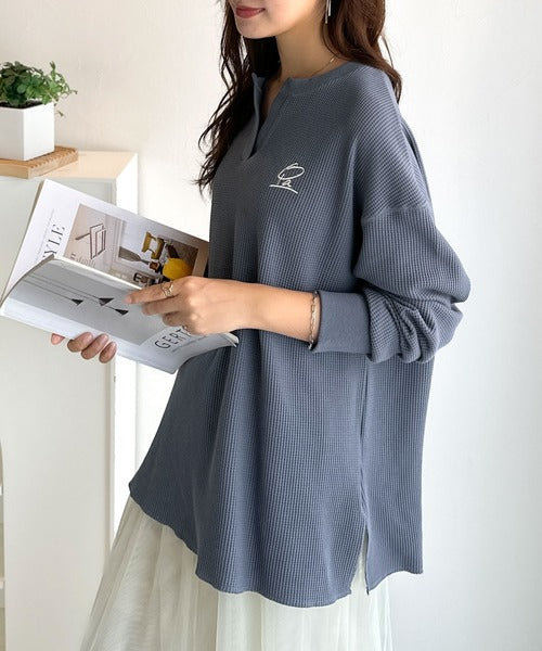 肌触りの良いワッフル素材に、キーネックデザインと胸刺繍でこなれ感を加えたロングTシャツ。