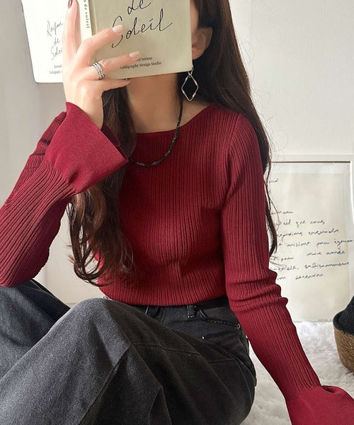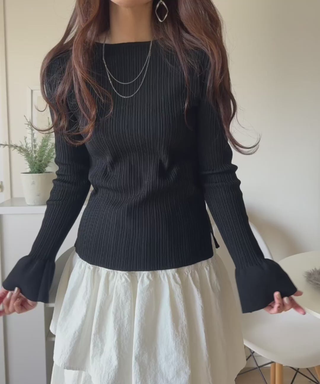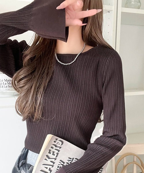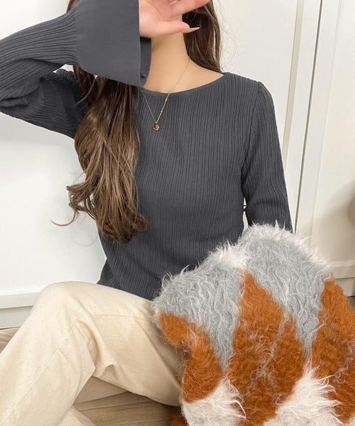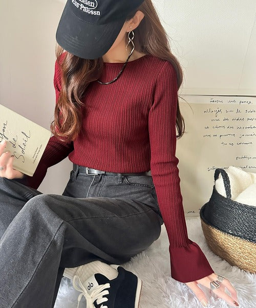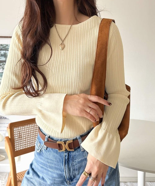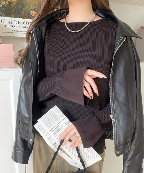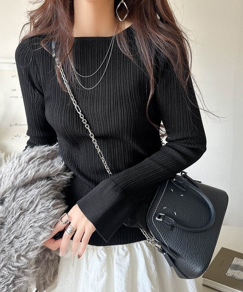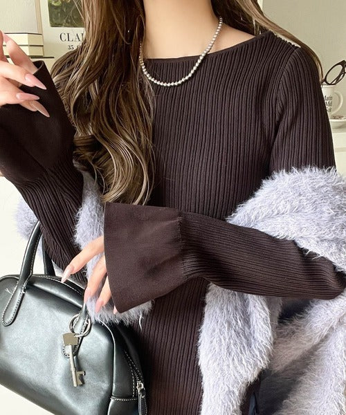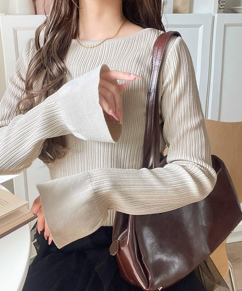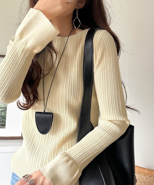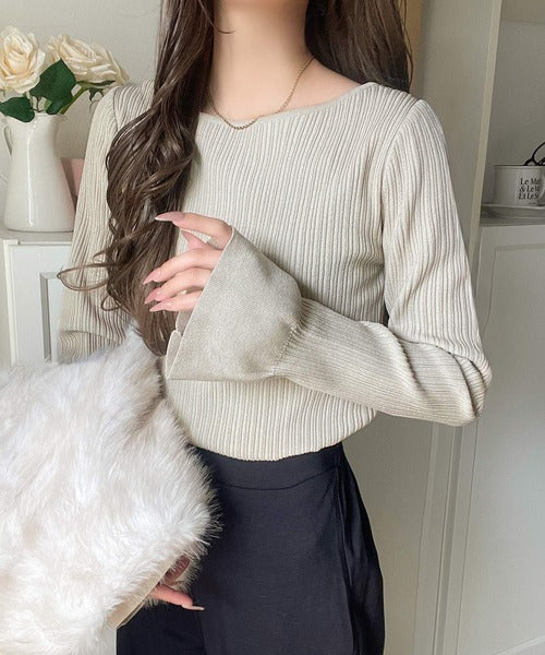 シンプルに差をつける、袖口フレアの美ライン。ランダムリブボートネックニット ce1050339