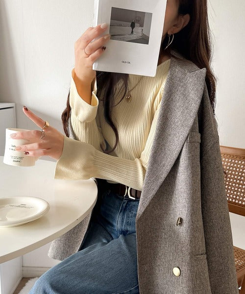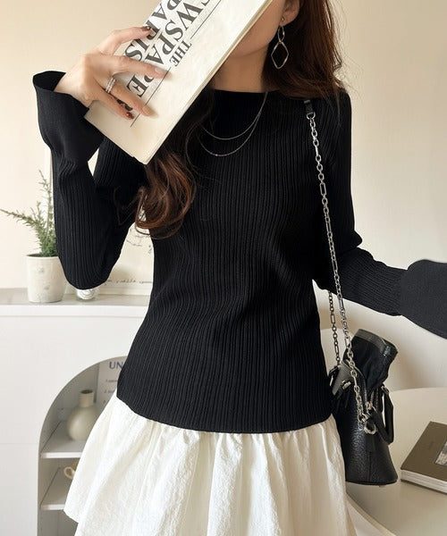 程よく開いたボートネックがデコルテをきれいに見せてくれる、大人仕様のリブニット。
