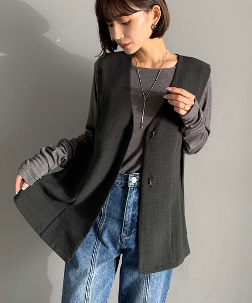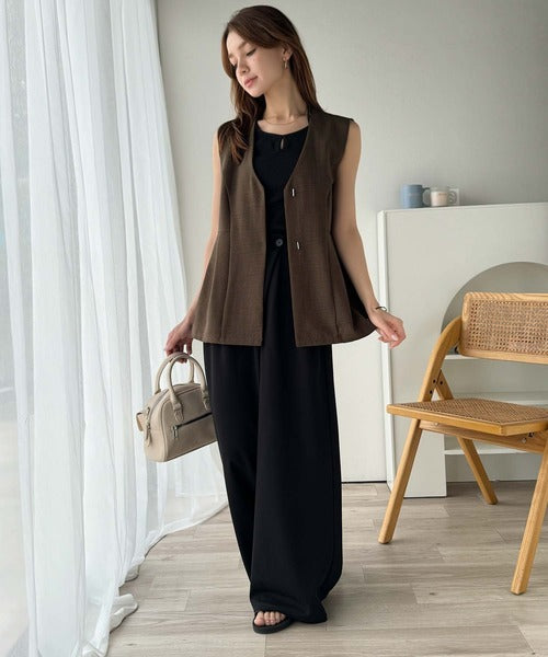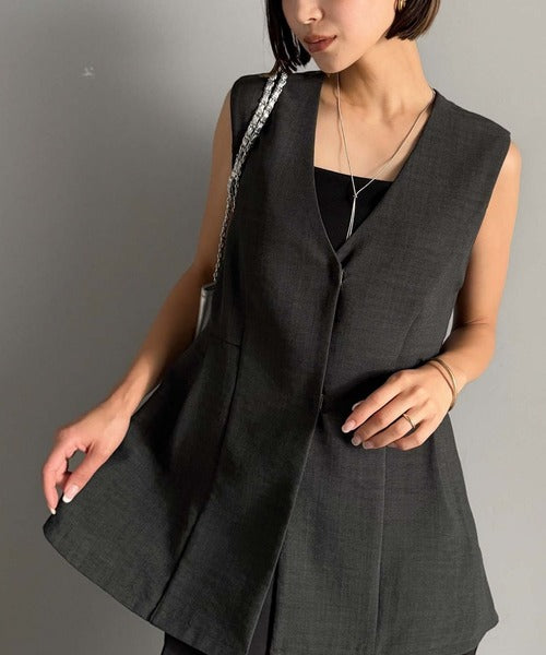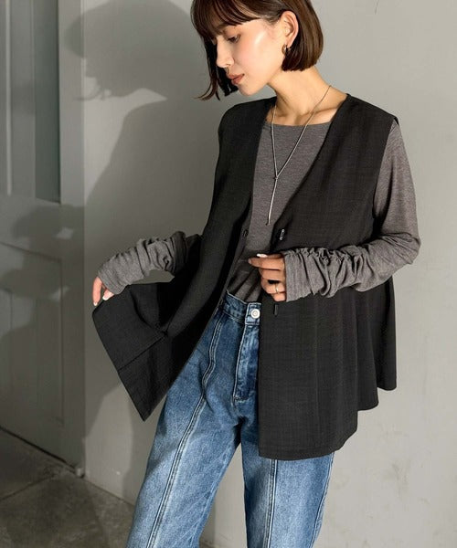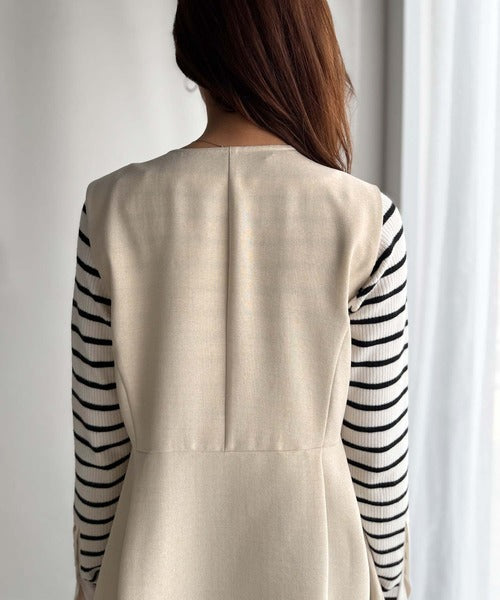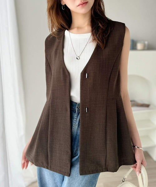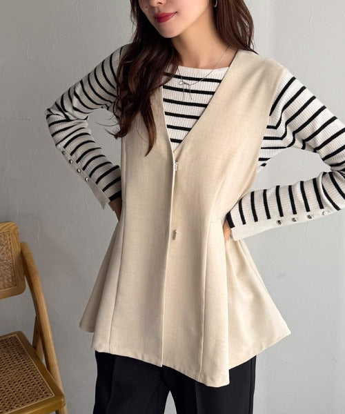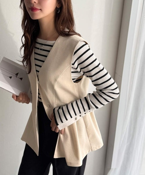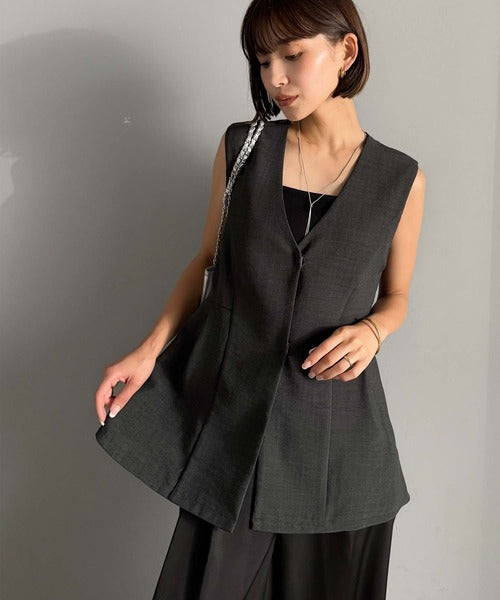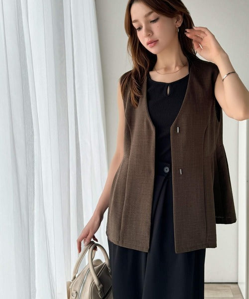 羽織るだけで旬顔に仕上がる「比翼デザインペプラムジレベスト」。