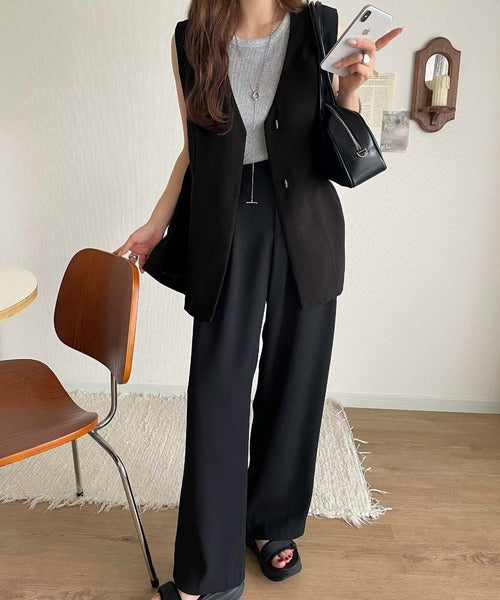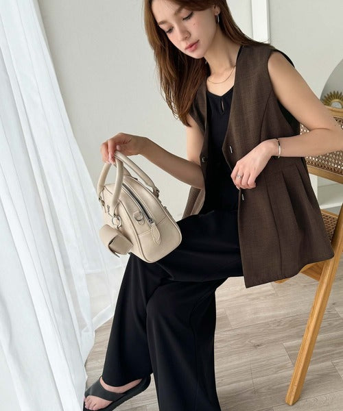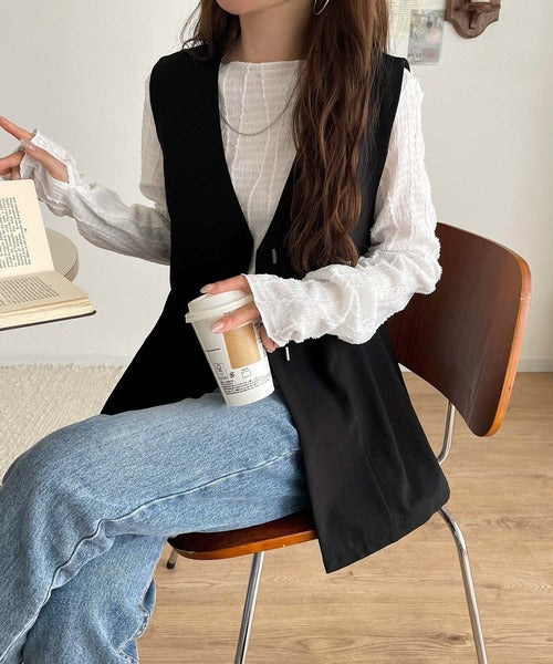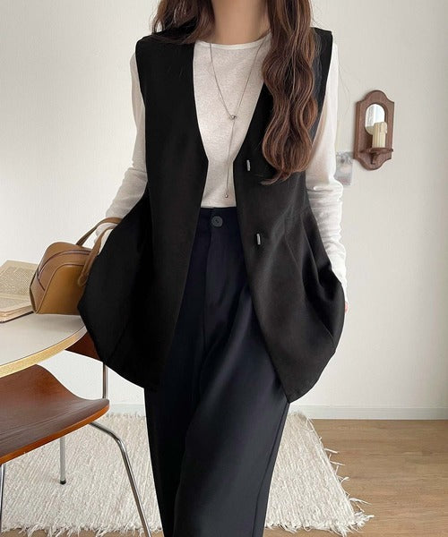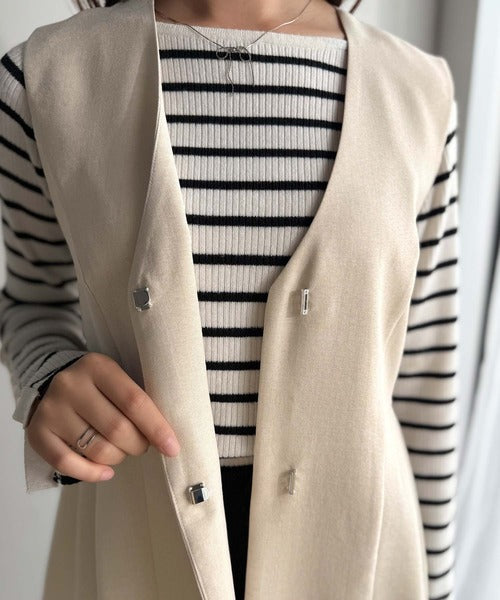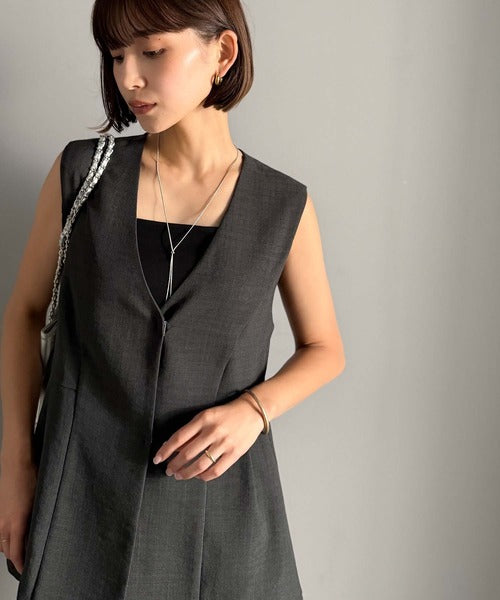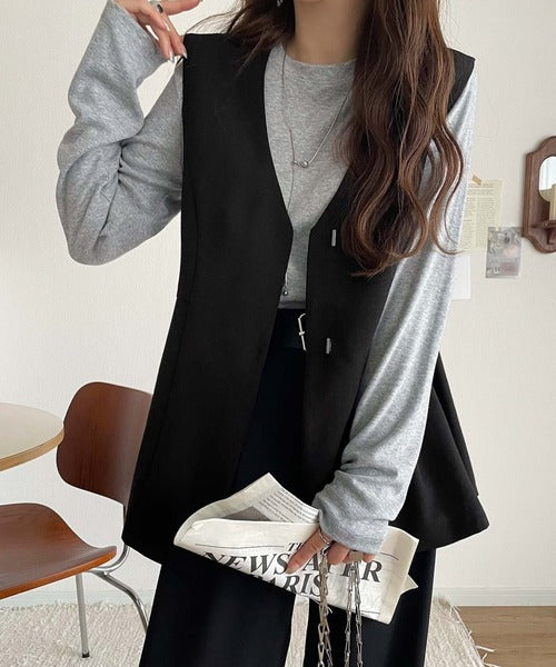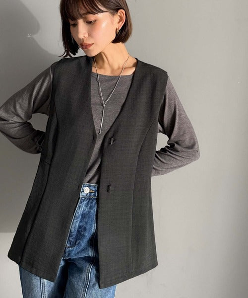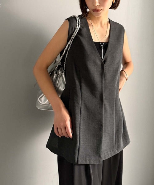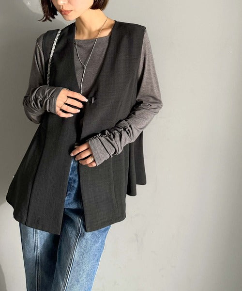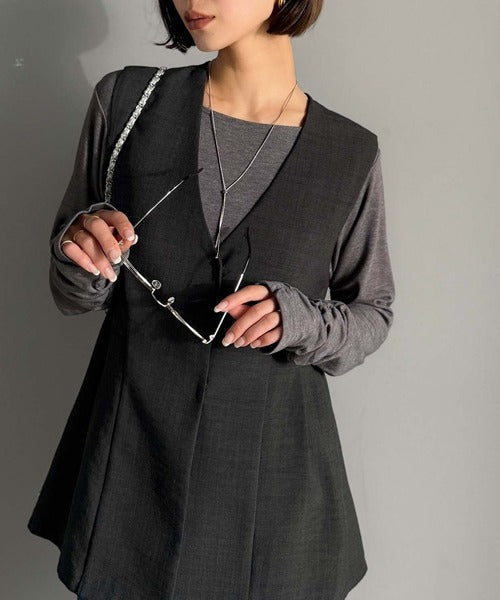 羽織るだけで旬顔に仕上がる「比翼デザインペプラムジレベスト」。