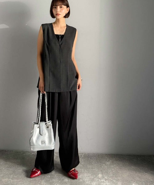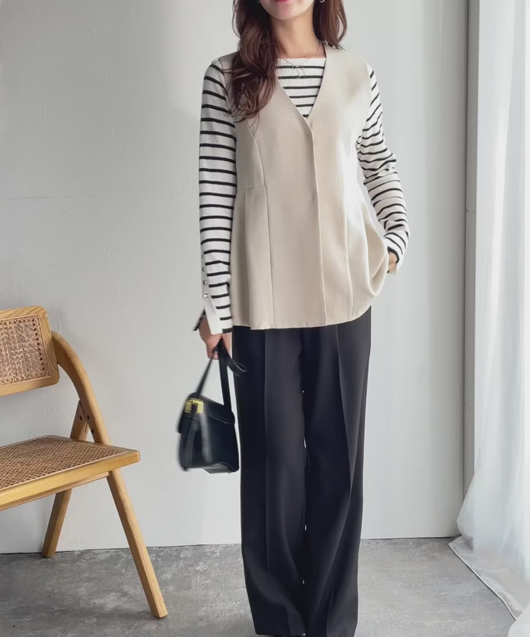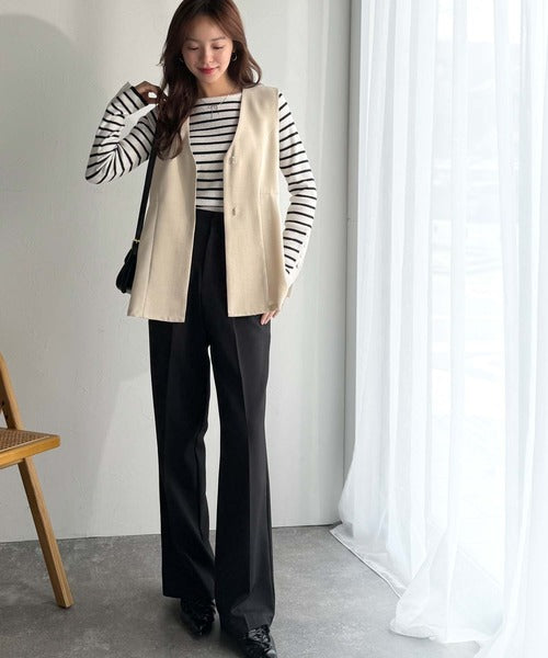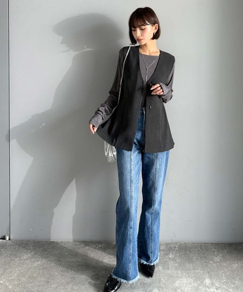 ノーカラー×Vネックがデコルテをきれいに見せ、すっきりとした女性らしい印象に仕上げてくれます。