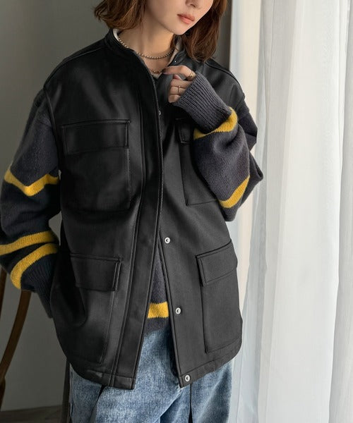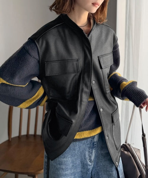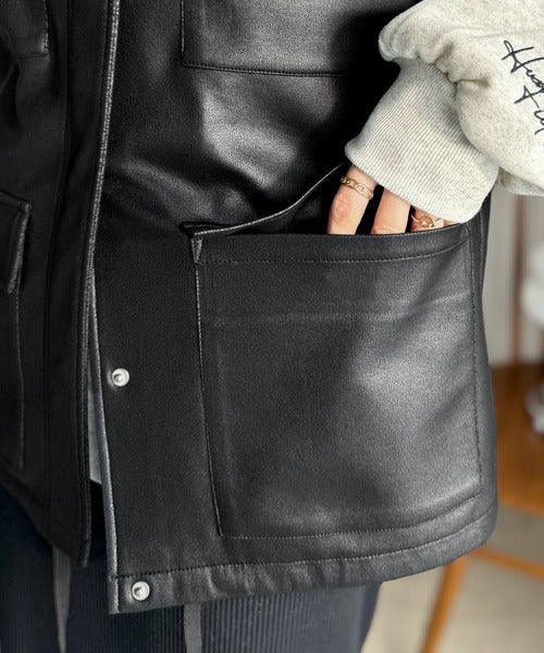 トレンド感満載のレザー風加工スエードミリタリーベスト。