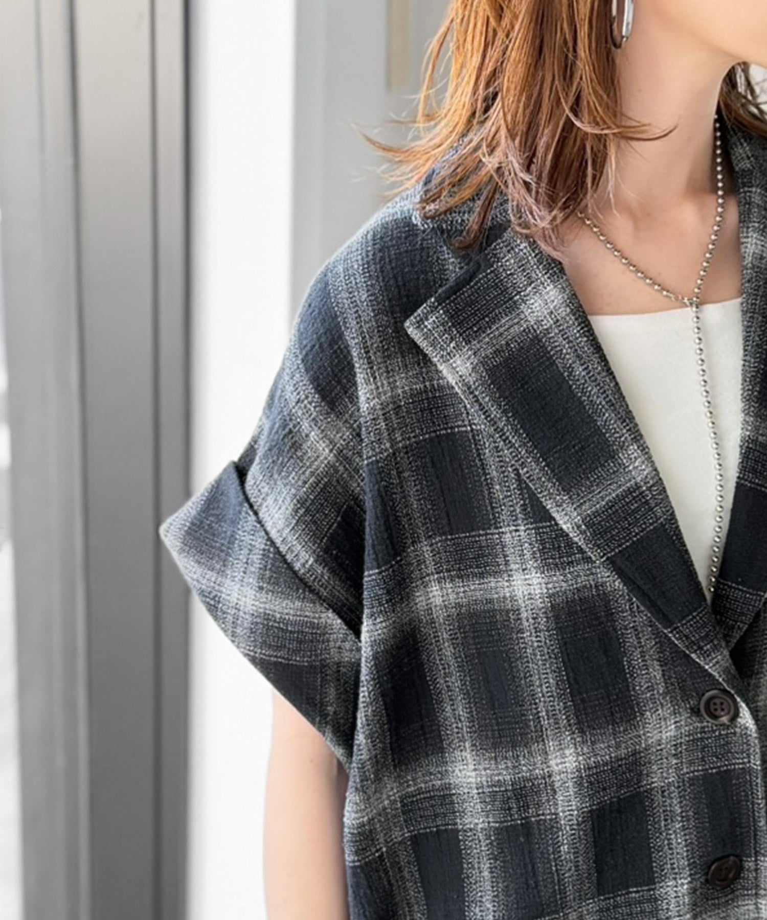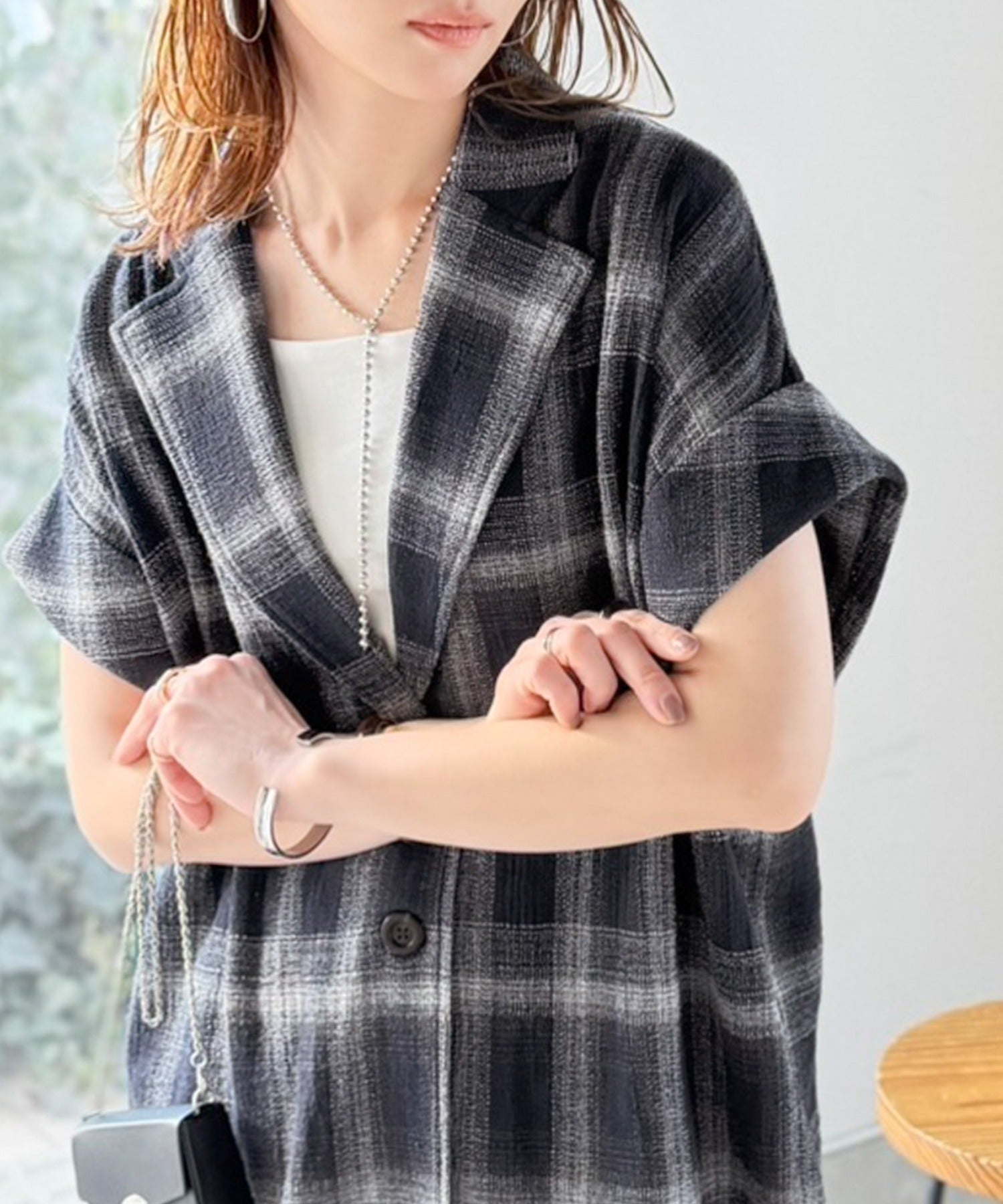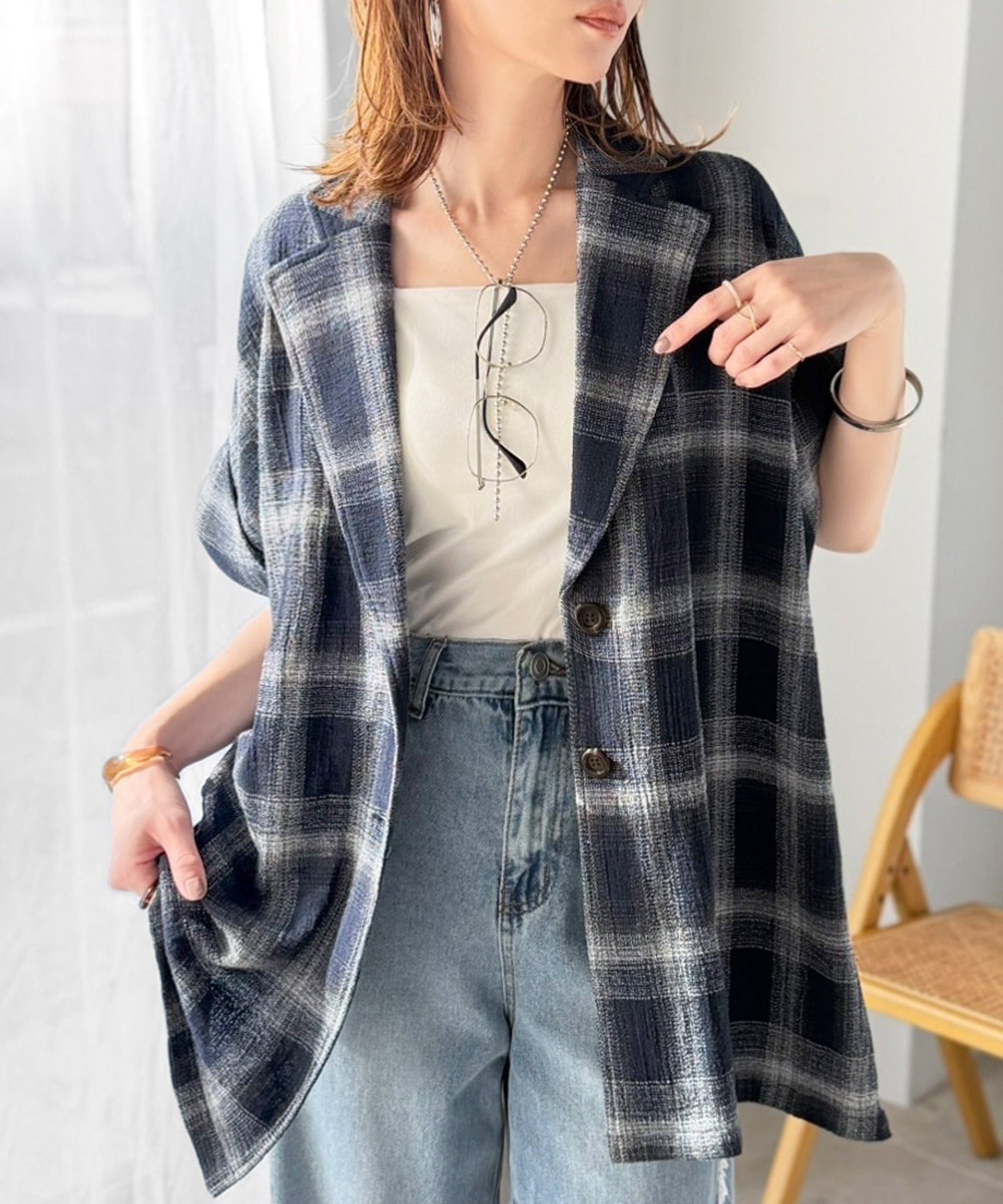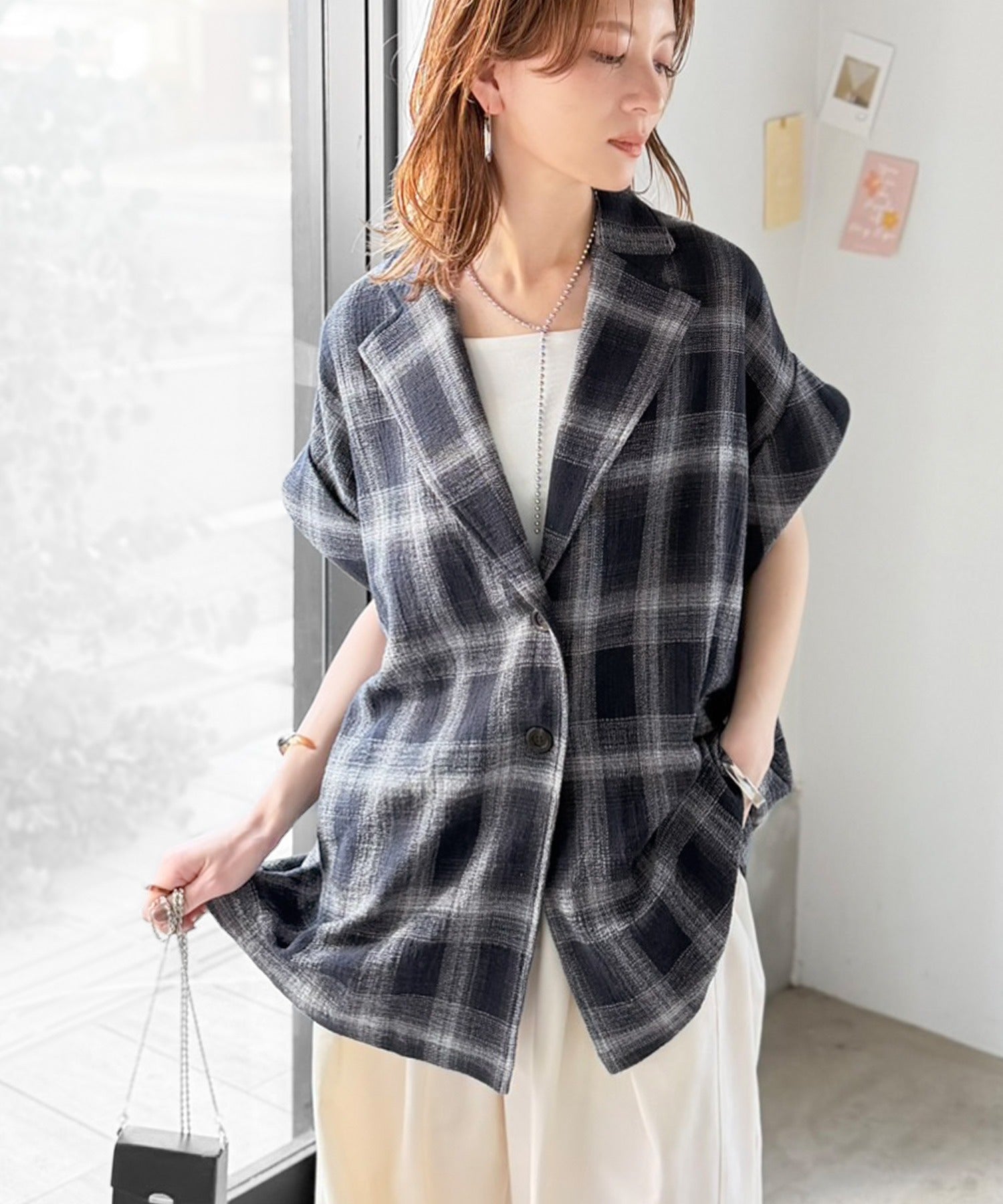 軽やかに羽織れて大人カジュアル映え。パナマ風チェック半袖ジャケット ce1010592