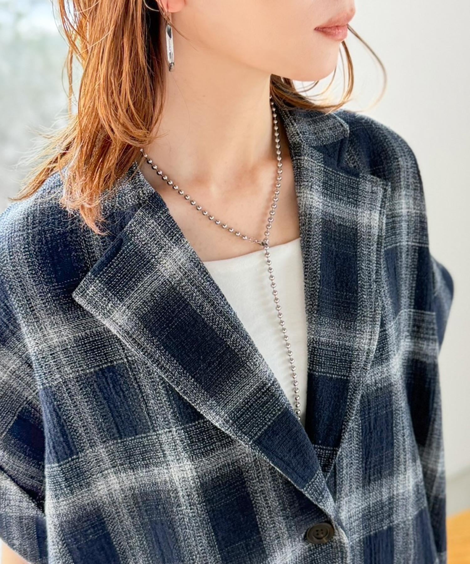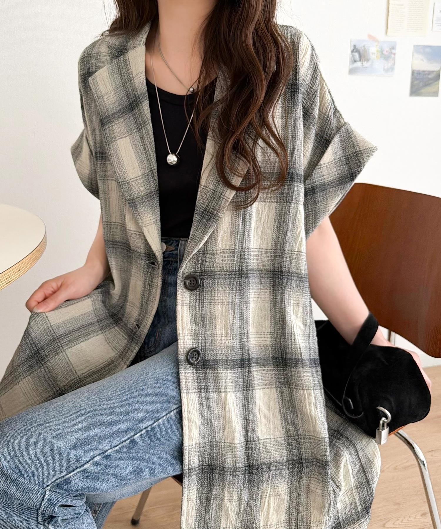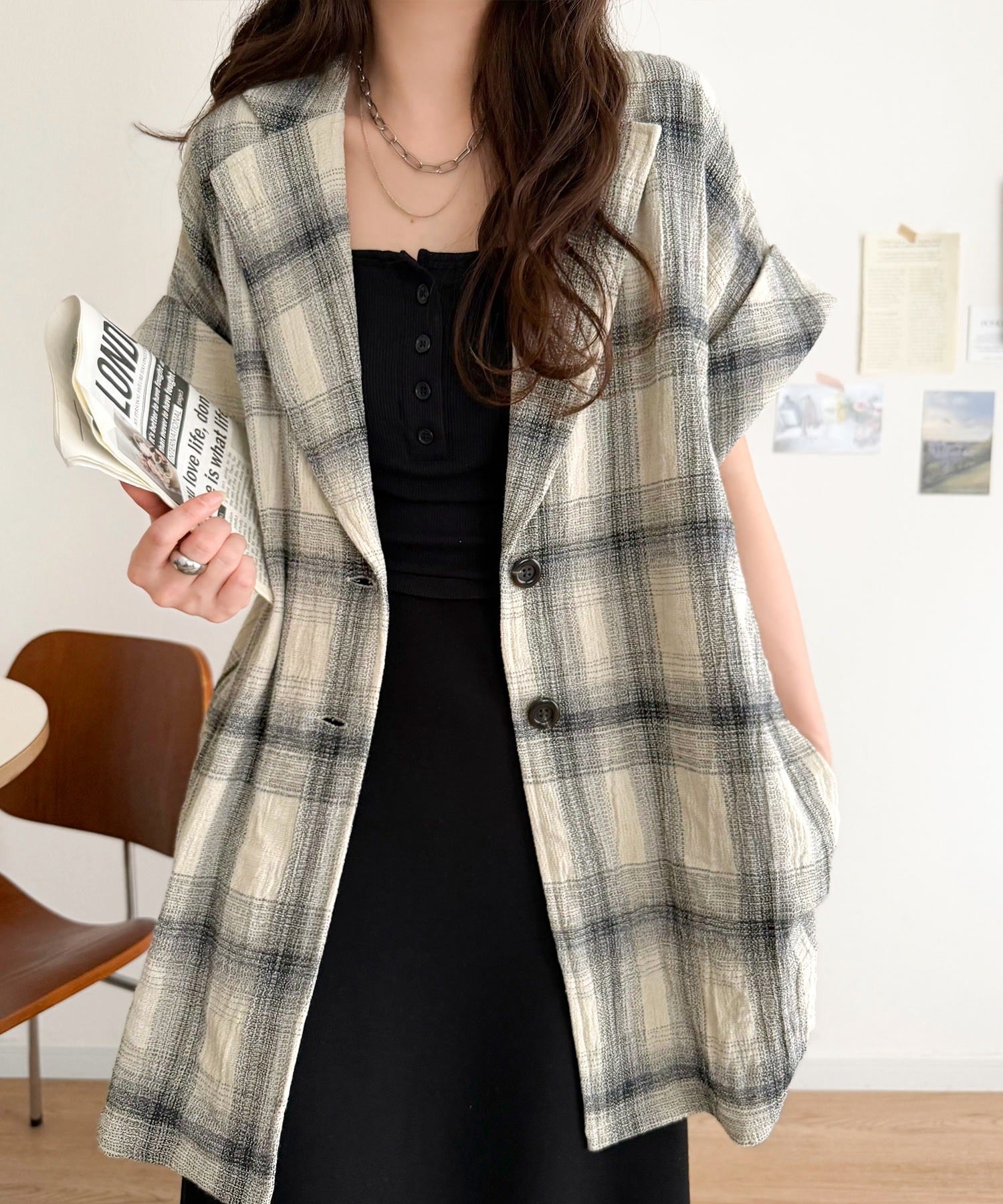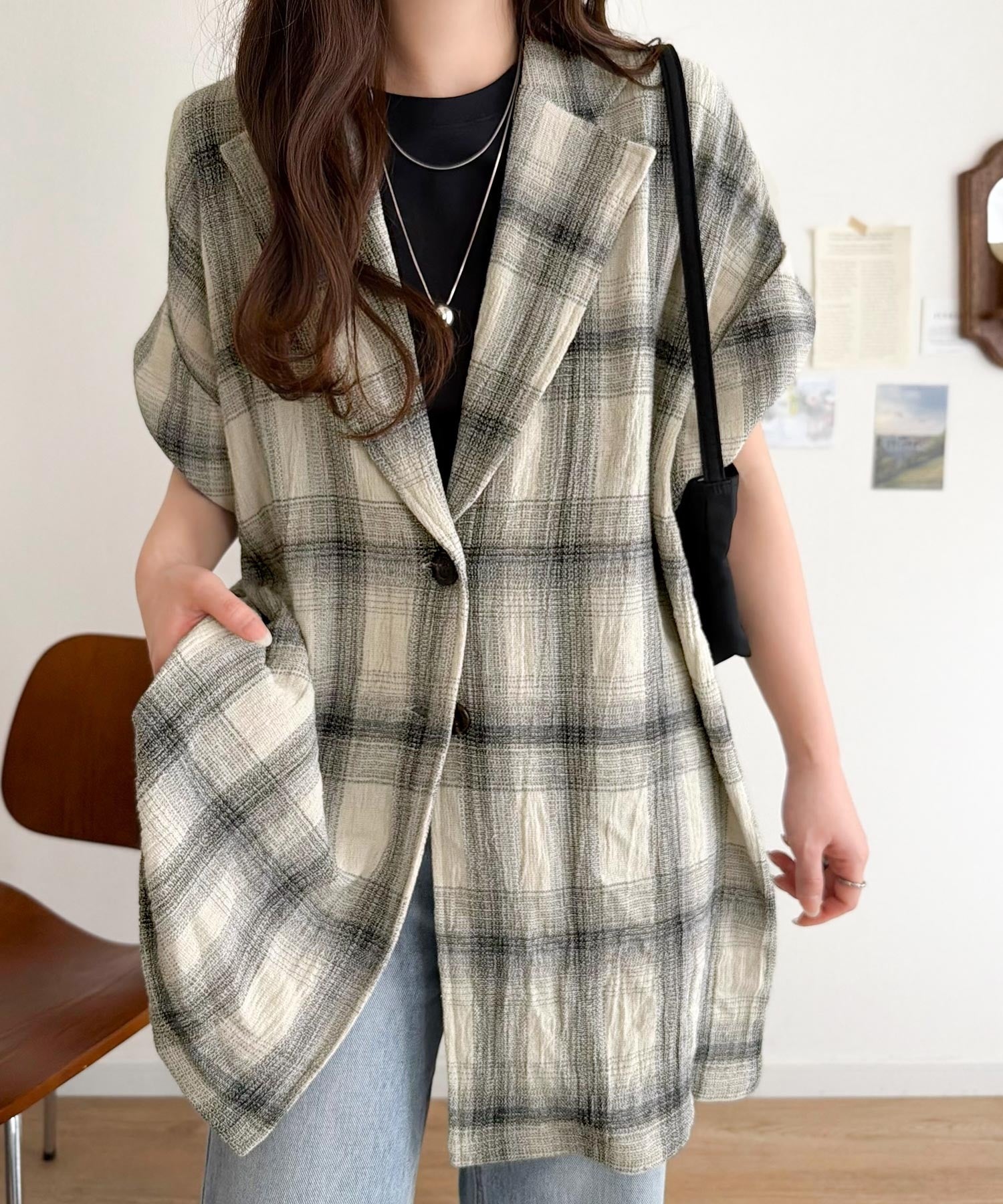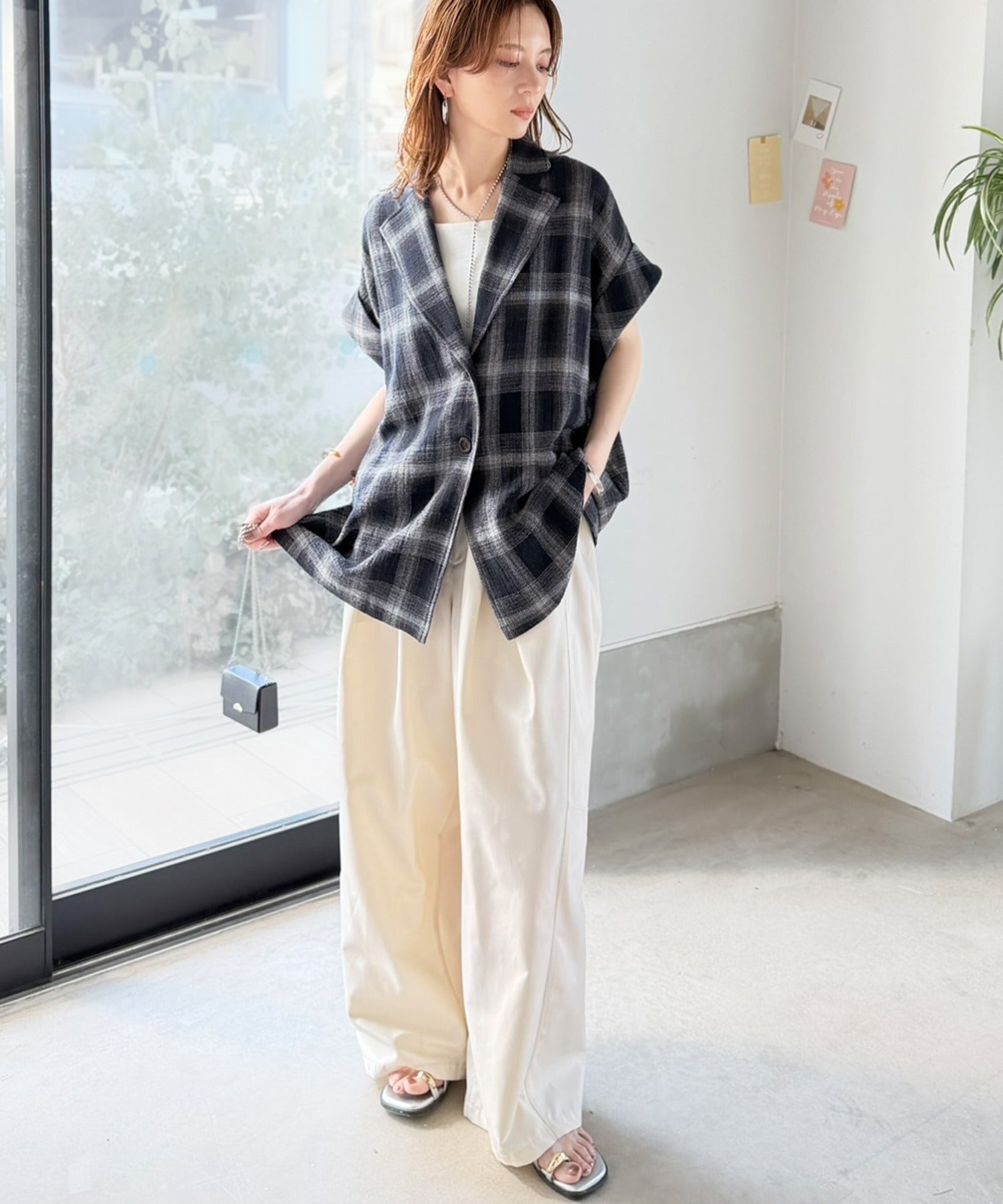 軽やかに羽織れて大人カジュアル映え。パナマ風チェック半袖ジャケット ce1010592