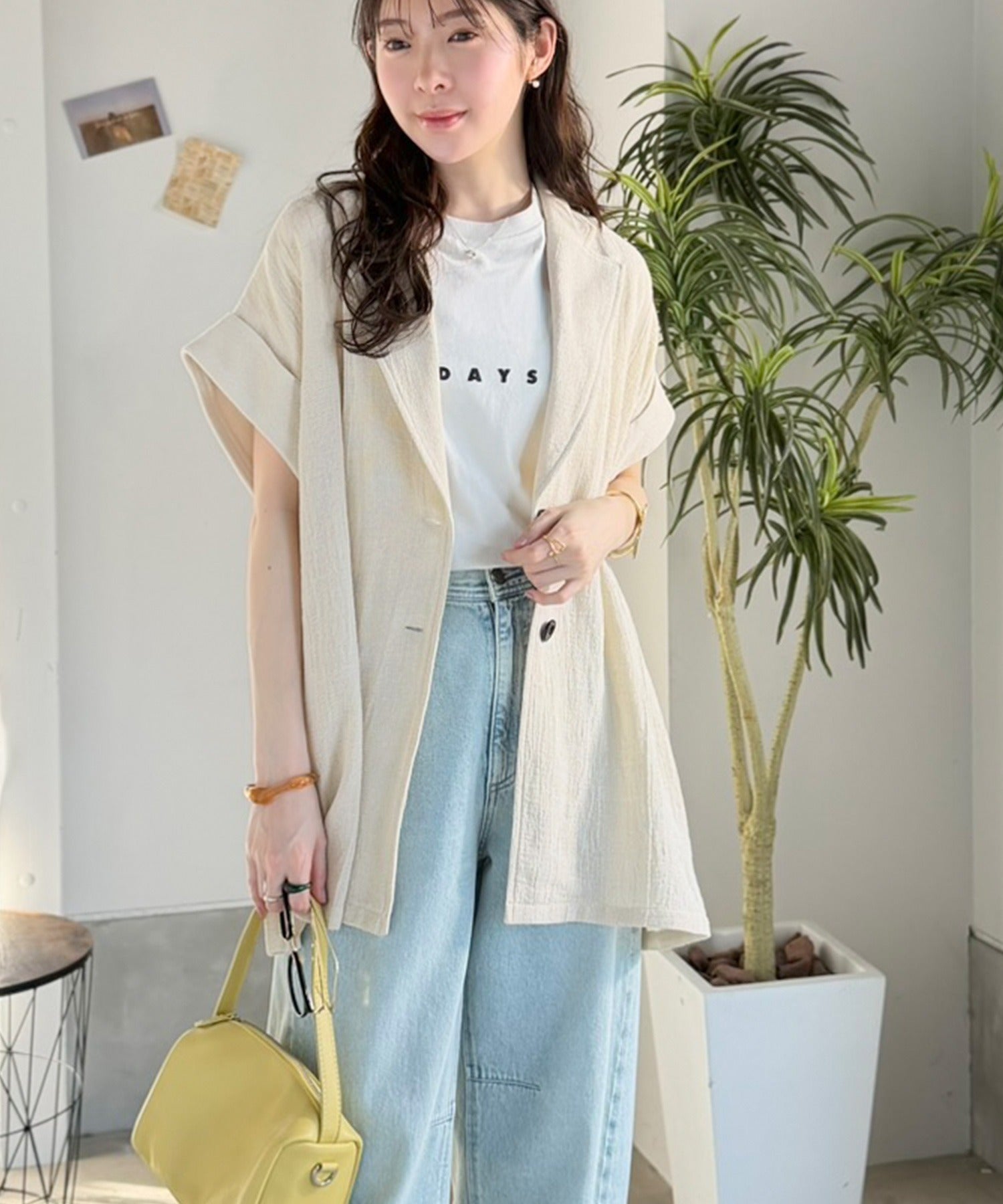 ロゴTシャツ×デニムにさっと羽織り、