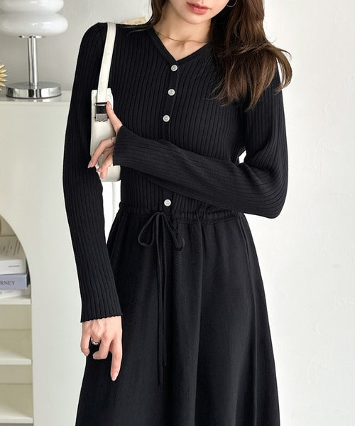 スタイルを引き立てるウエストリボンが特徴のニットワンピース。