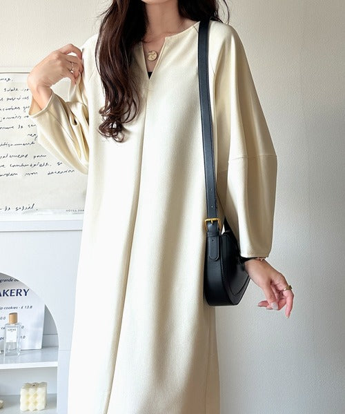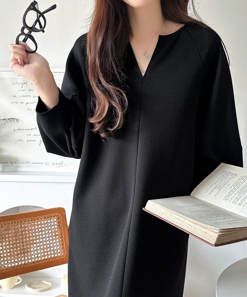 ふんわり袖と深めネックが魅力の軽やかワンピース!