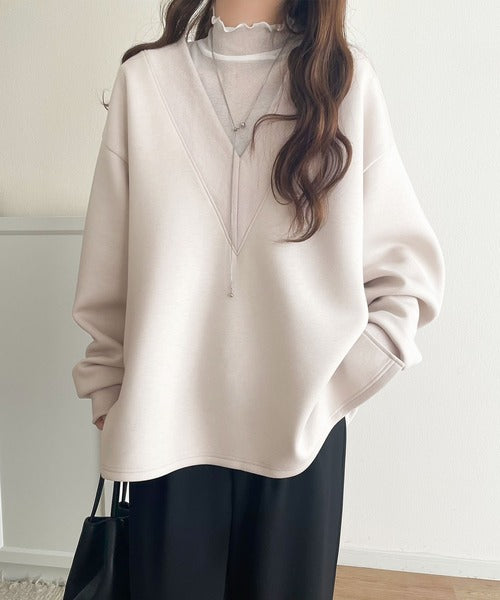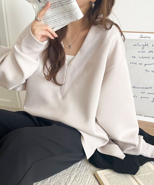 リブ切替のVネックで顔まわりすっきり、小顔&華奢魅せ効果◎